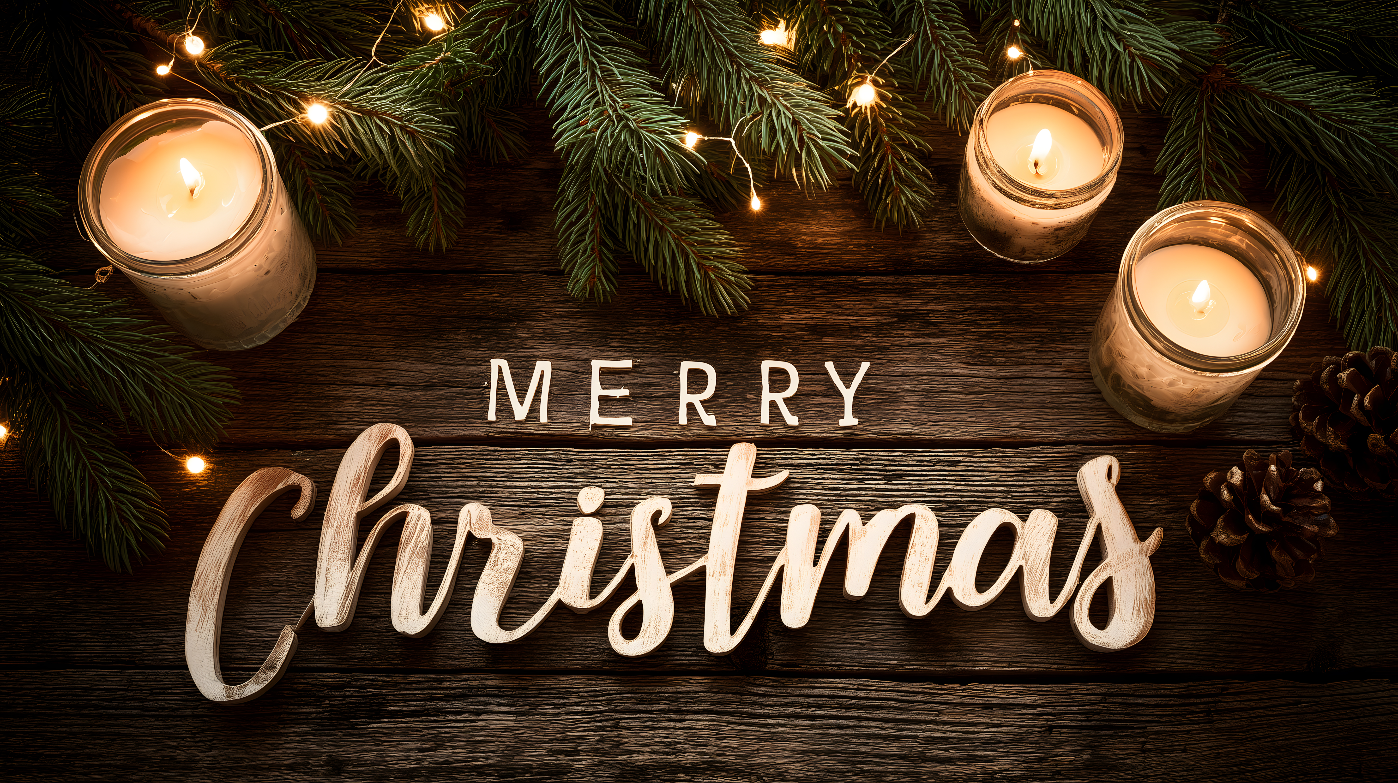 Dieses stimmungsvolle Weihnachtsfoto zeigt einen festlichen Gruß mit Kerzen und Tannenzweigen auf einem rustikalen Holzbrett. Die warmen Kerzenflammen und die grünen Tannenzweige schaffen eine gemütliche, winterliche Atmosphäre. Die Lichterkette und die Tannenzapfen runden die dekorative Komposition ab und verleihen dem Bild einen charmant-authentischen Charakter. Dieses kostenfreie Stockfoto in hoher Auflösung eignet sich hervorragend für Weihnachtsgrußkarten, Newsletter-Gestaltungen, Blogbeiträge oder Werbeanzeigen rund um die Weihnachtszeit. Es steht unter einer Creative-Commons-Lizenz und kann somit frei genutzt werden.