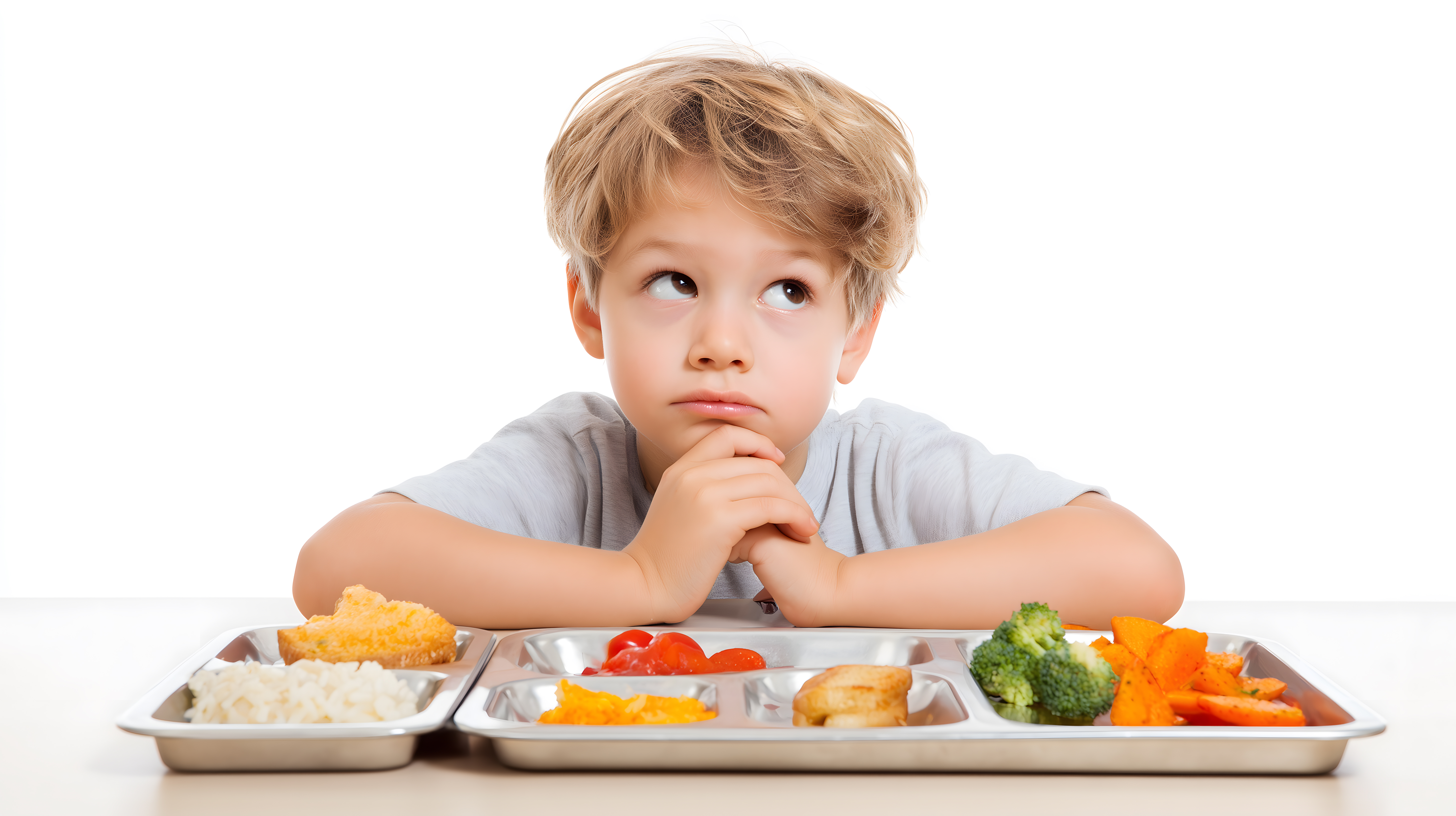 Das Foto zeigt einen nachdenklichen Jungen, der an einem Tablett mit gesunder Mahlzeit sitzt. Vor ihm sind verschiedene Lebensmittel wie Gemüse, Obst und Brötchen angerichtet. Der Junge blickt sinnierend auf den Teller, als würde er überlegen, was er essen möchte. Das Bild vermittelt ein Gefühl der Konzentration und des Nachdenkens rund um das Thema gesunde Ernährung.