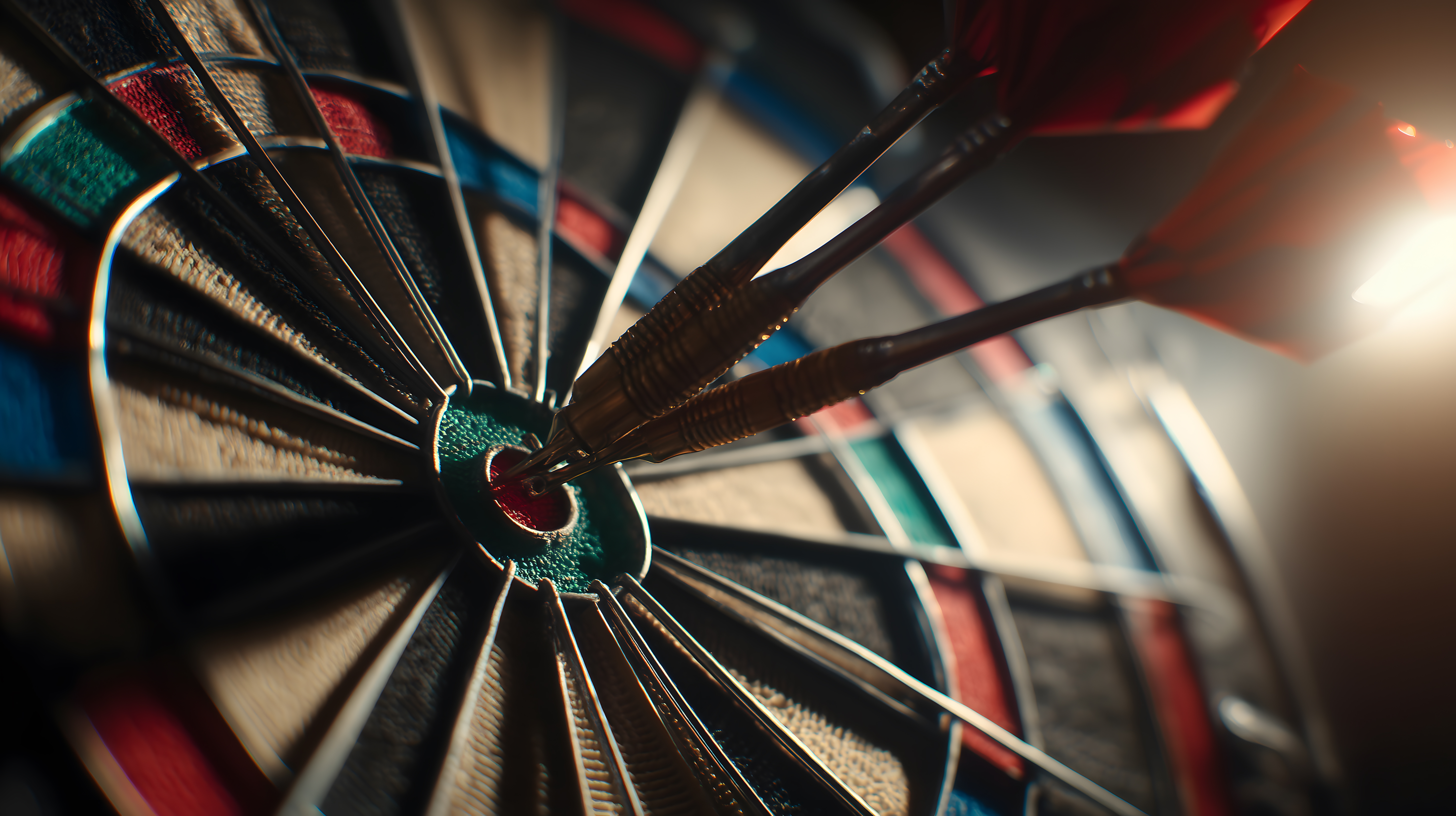 Das Foto zeigt eine Nahaufnahme einer Dartscheibe mit einem präzise im Bullseye-Zentrum platzierten Dartpfeil. Die scharfe Fokussierung auf den Pfeil und die kontraststarken Farben der Dartscheibe - Schwarz, Rot, Grün - verleihen dem Bild eine dynamische und konzentrierte Atmosphäre. Diese Aufnahme eignet sich hervorragend als Stockfoto für Blog-Beiträge, Newslettergestaltung oder Social-Media-Posts rund um Themen wie Sport, Zielstrebigkeit, Konzentration oder Präzision. Das hochauflösende Foto ist unter einer Creative-Commons-Lizenz frei verwendbar.