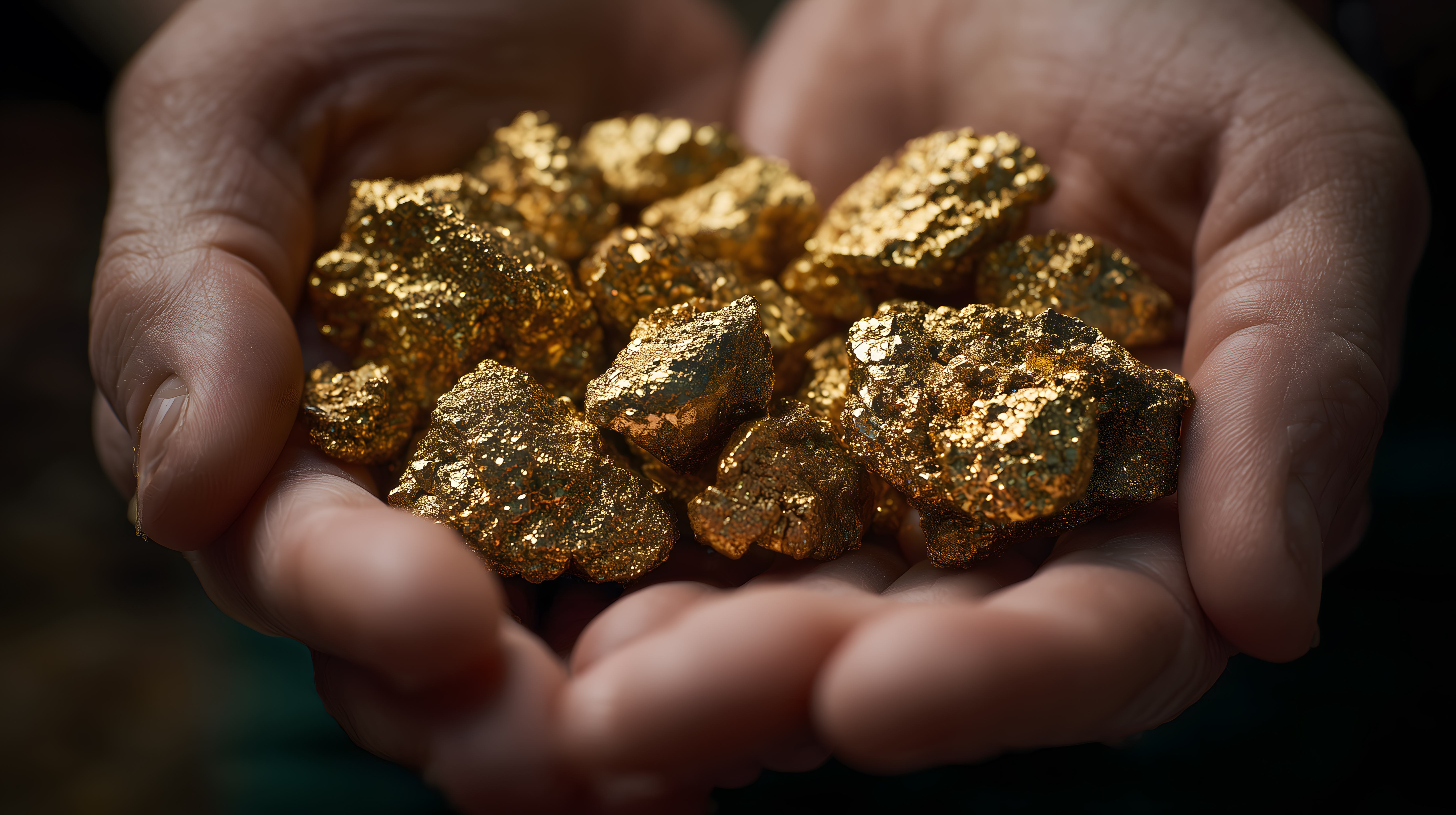 Das Bild zeigt eine Nahaufnahme von glänzenden Goldnuggets, die von Menschenhänden gehalten werden. Die goldenen Brocken heben sich deutlich vom dunklen Hintergrund ab und erzeugen einen starken Kontrast. Die Oberfläche der Nuggets reflektiert das Licht, was ihnen einen edlen, funkelnden Erscheinung verleiht. Dieses Foto eignet sich hervorragend als Stockfoto für verschiedene Einsatzbereiche, wie Blog-Artikel zu Themen wie Finanzen, Investitionen oder Bergbau. Mit seiner hohen Auflösung und kreativen Komposition kann es auch für Werbezwecke oder Social-Media-Posts verwendet werden. Das Bild steht unter einer Creative-Commons-Lizenz zur freien Nutzung zur Verfügung.