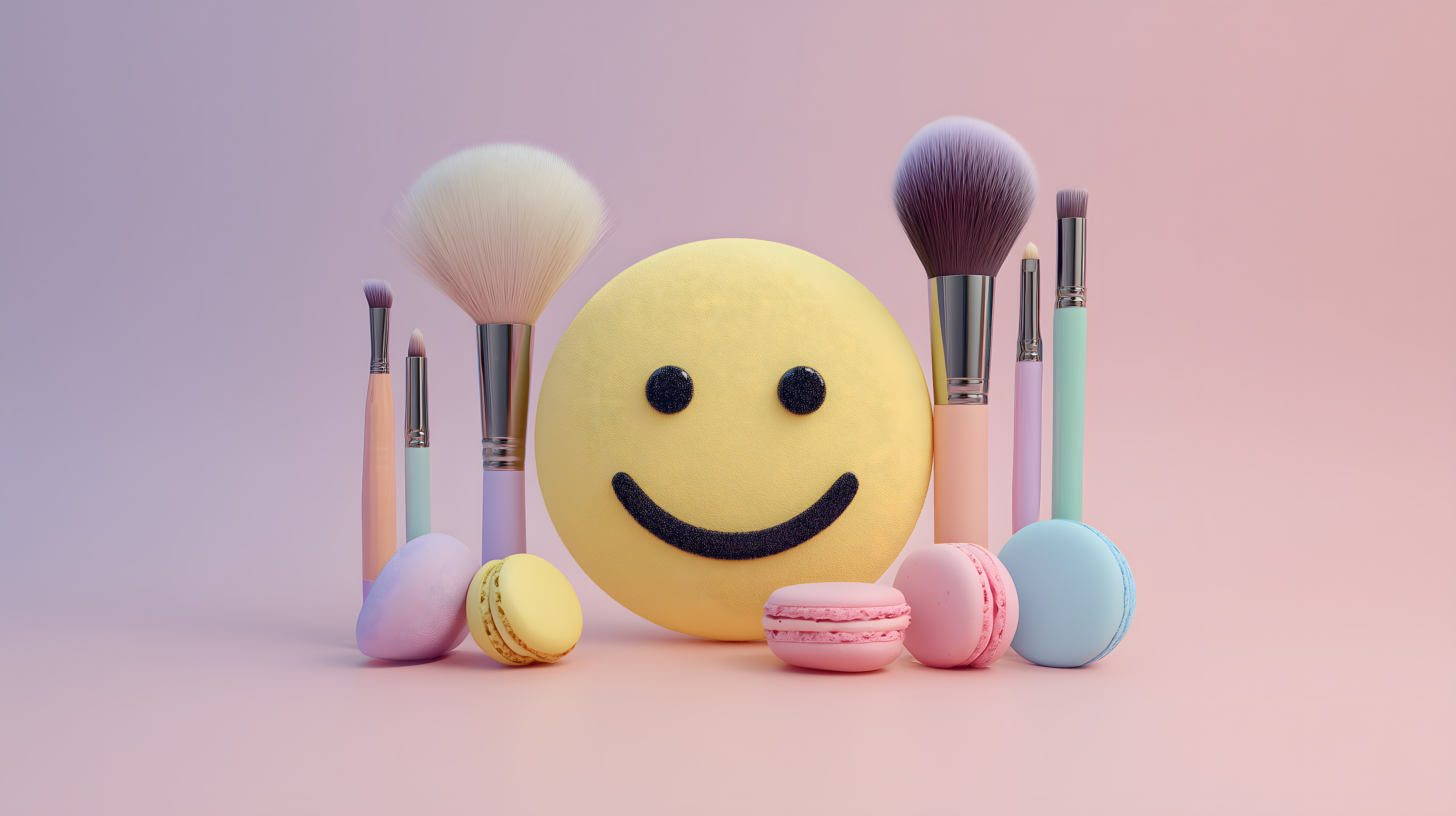 Dieses pastellfarbene Stillleben zeigt eine Auswahl an Kosmetikprodukten und Accessoires vor einem rosa-lila Hintergrund. Im Zentrum befindet sich ein lächelnder Emoji-Ball, umgeben von verschiedenen Make-up-Pinseln in Mintgrün und Puderfarben. Daneben sind Makronen in Pastellfarben sowie ein kleines Kosmetikpröbchen zu sehen. Die Anordnung und Farbgebung erzeugt eine frische, feminine und ästhetische Atmosphäre. Dieses hochwertige Stockfoto eignet sich hervorragend für den Einsatz in Blogs, Newsletter-Gestaltungen, Social-Media-Posts oder Werbematerial rund um Schönheit, Kosmetik und Lifestyle-Themen. Das Bild steht unter einer Creative-Commons-Lizenz zur freien Verwendung zur Verfügung.