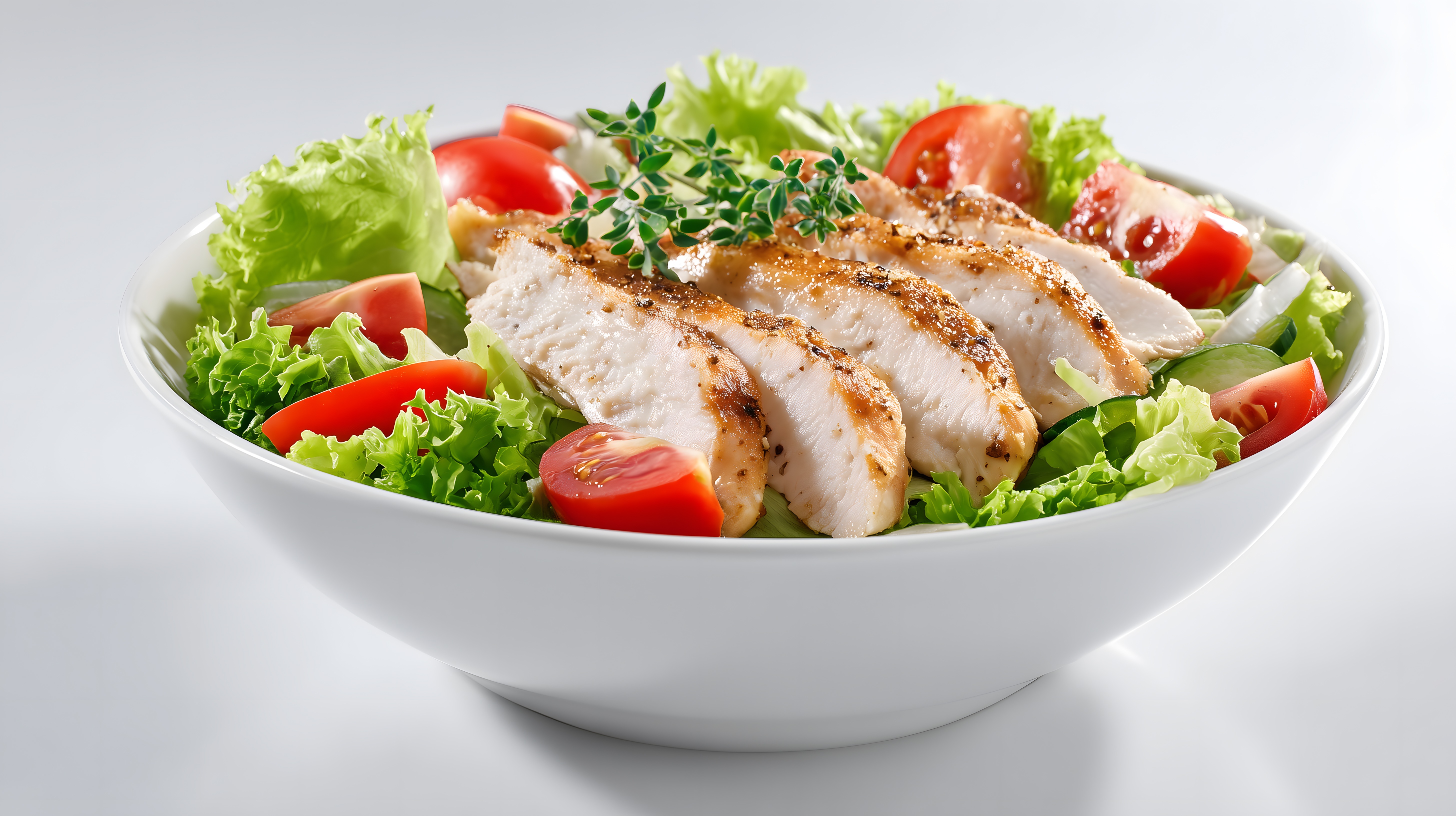 Das Bild zeigt einen appetitlichen Hähnchensalat in einer weißen Schale. Der Salat besteht aus knackigem grünem Salat, roten Tomaten, Hähnchenbrust und dekorativem Grün. Die Zutaten sind frisch und sorgfältig angerichtet, sodass der Salat ein gesundes und leckeres Mittagessen oder Sommeressen vermittelt. Das Bild eignet sich hervorragend als Rezeptfoto oder für die Verwendung in Blogbeiträgen, Newslettern oder Social-Media-Posts zu den Themen gesunde Ernährung, Lebensmittel und Sommerrezepte. Das hochauflösende Stockfoto steht unter einer Creative-Commons-Lizenz zur Verfügung und kann für verschiedene kommerzielle und redaktionelle Zwecke genutzt werden.
