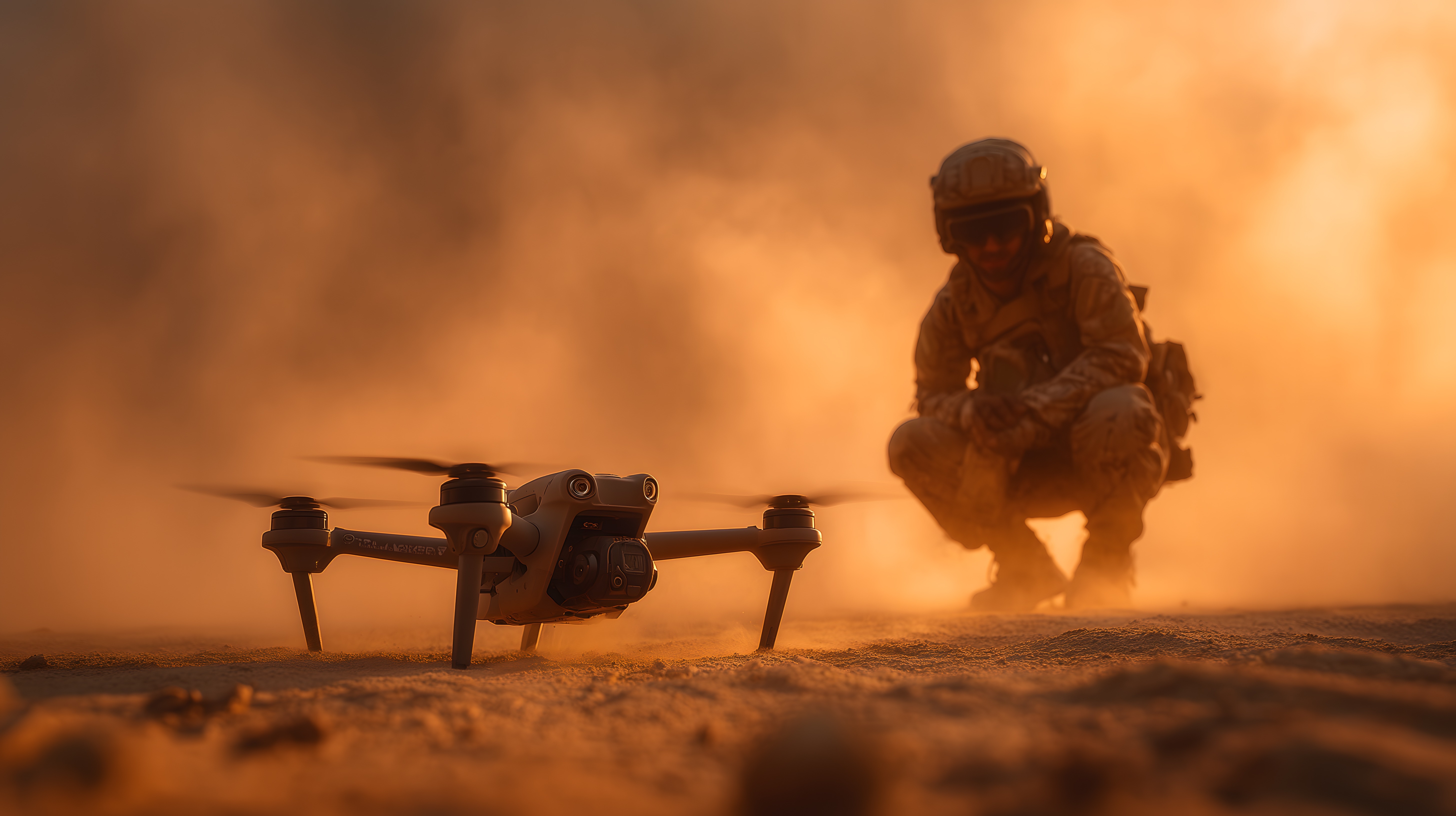 Das Bild zeigt eine bedrohliche Militärszene im Dunkeln: Eine Drohne schwebt über dem Boden, während ein Soldat in voller Ausrüstung in der Staubwolke kauert. Die düstere, orange Beleuchtung und der aufgewühlte Staub verleihen der Szene eine angespannte, kriegerische Atmosphäre. Dieses hochauflösende Stockfoto eignet sich hervorragend für den Einsatz in Blogs, Newslettern oder Social-Media-Beiträgen zum Thema Militär, Technik oder Bedrohungssituationen. Es steht unter einer kostenlosen Creative-Commons-Lizenz zur Verfügung.