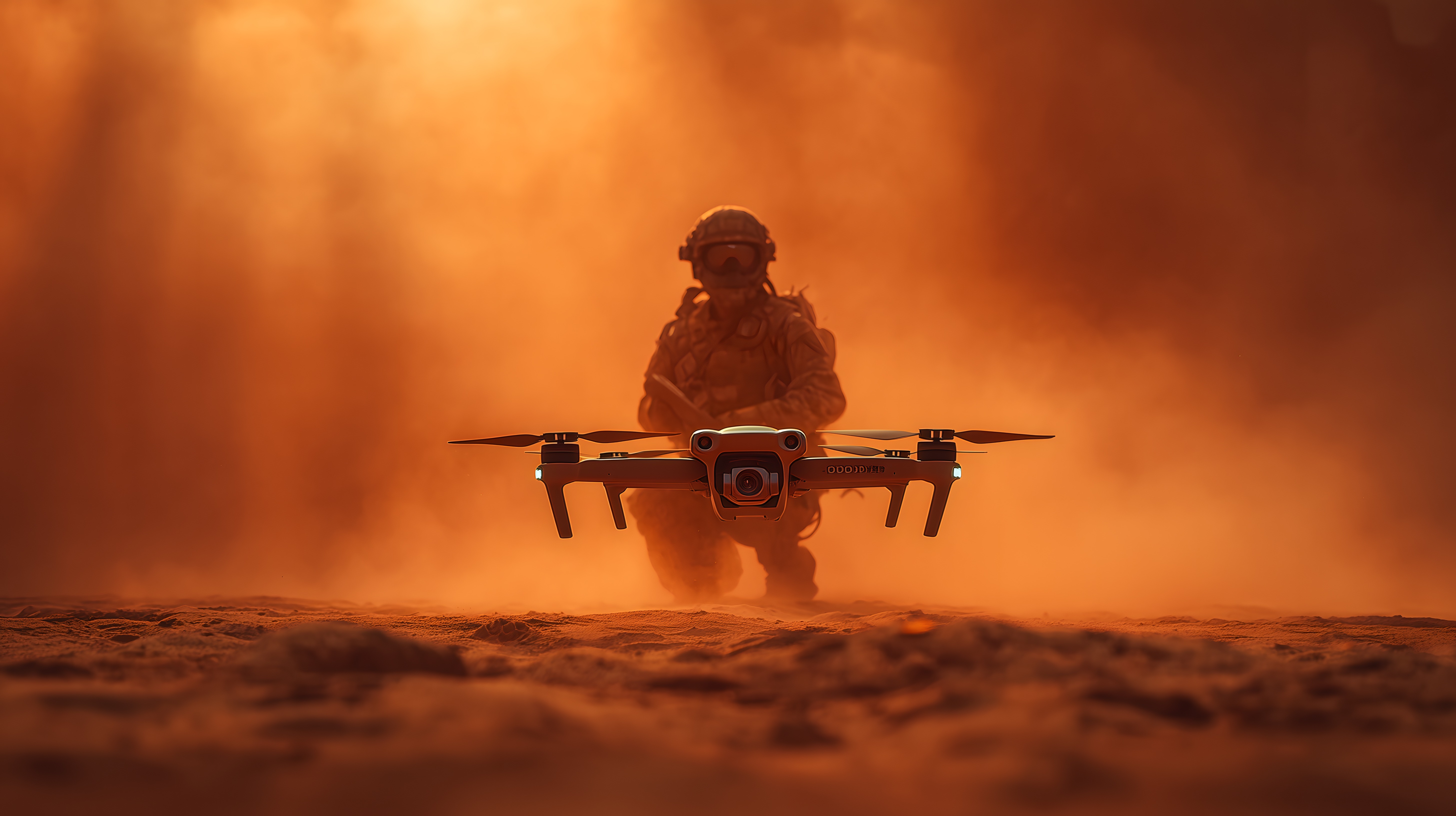 Das Bild zeigt eine Drohne, die in einem orange-rötlichen Sandsturm fliegt. Der Pilot in voller Kampfausrüstung ist deutlich vor der staubigen Kulisse zu erkennen. Die Szene vermittelt den Eindruck einer actionreichen Militärübung oder eines Einsatzes in einer unwirtlichen Umgebung.