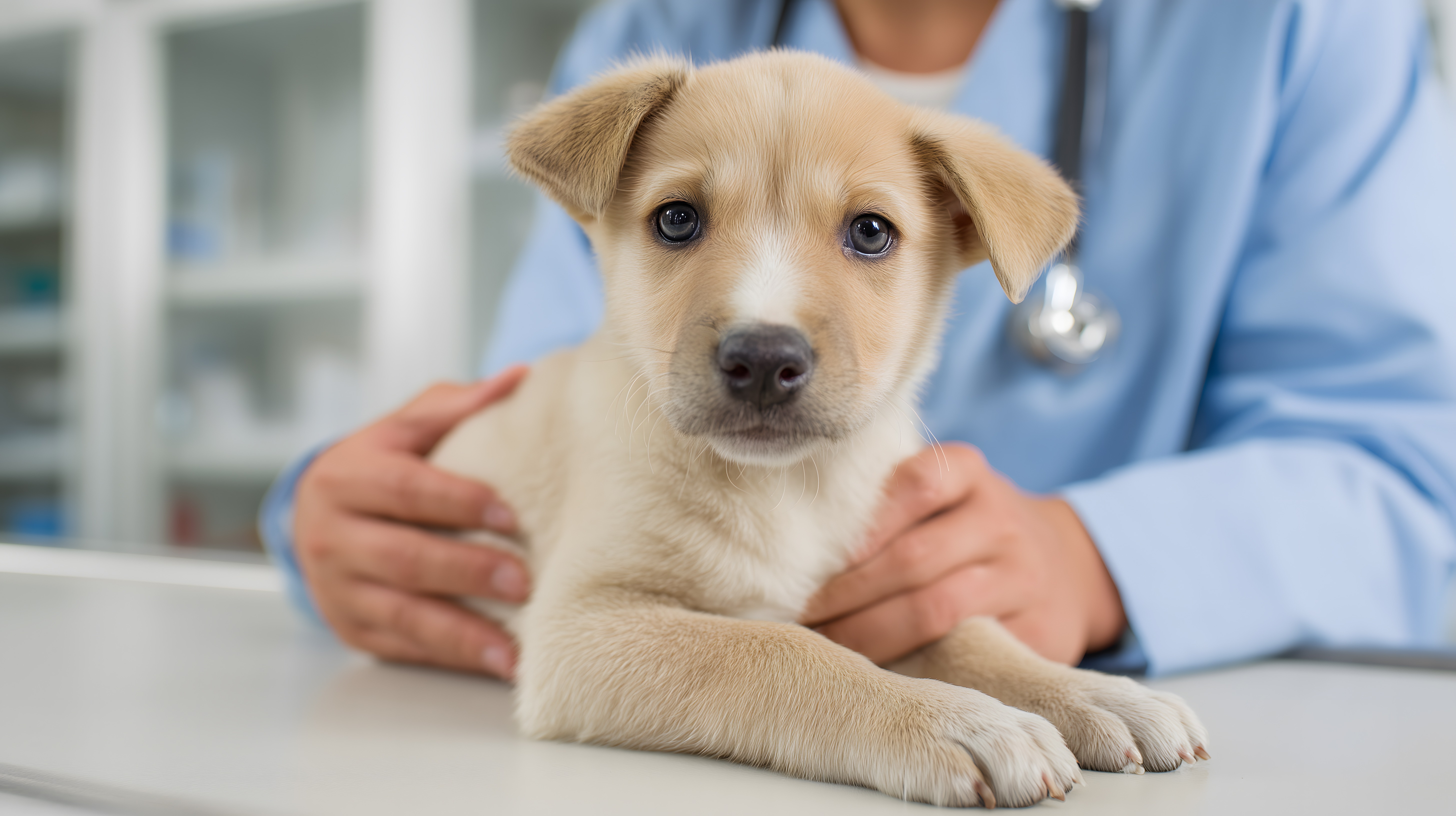 Dieses Foto zeigt einen jungen, niedlichen Hund, der von einem Tierarzt in einem Besuchsraum der Tierklinik untersucht wird. Der Welpe sitzt auf einer Untersuchungsliege und blickt mit großen, vertrauensvollen Augen in die Kamera. Der Tierarzt im blauen Kittel hält den Hund vorsichtig, um ihn für die Untersuchung oder Behandlung vorzubereiten. Das Foto strahlt Ruhe und Sicherheit aus und eignet sich ideal für den Einsatz in Blogs, Newslettern oder Werbematerialien rund um das Thema Haustiere, Tiergesundheit und Veterinärmedizin. Dieses hochauflösende und kostenfrei nutzbare Stockfoto unter Creative-Commons-Lizenz lässt sich hervorragend für verschiedenste Zwecke einsetzen.
