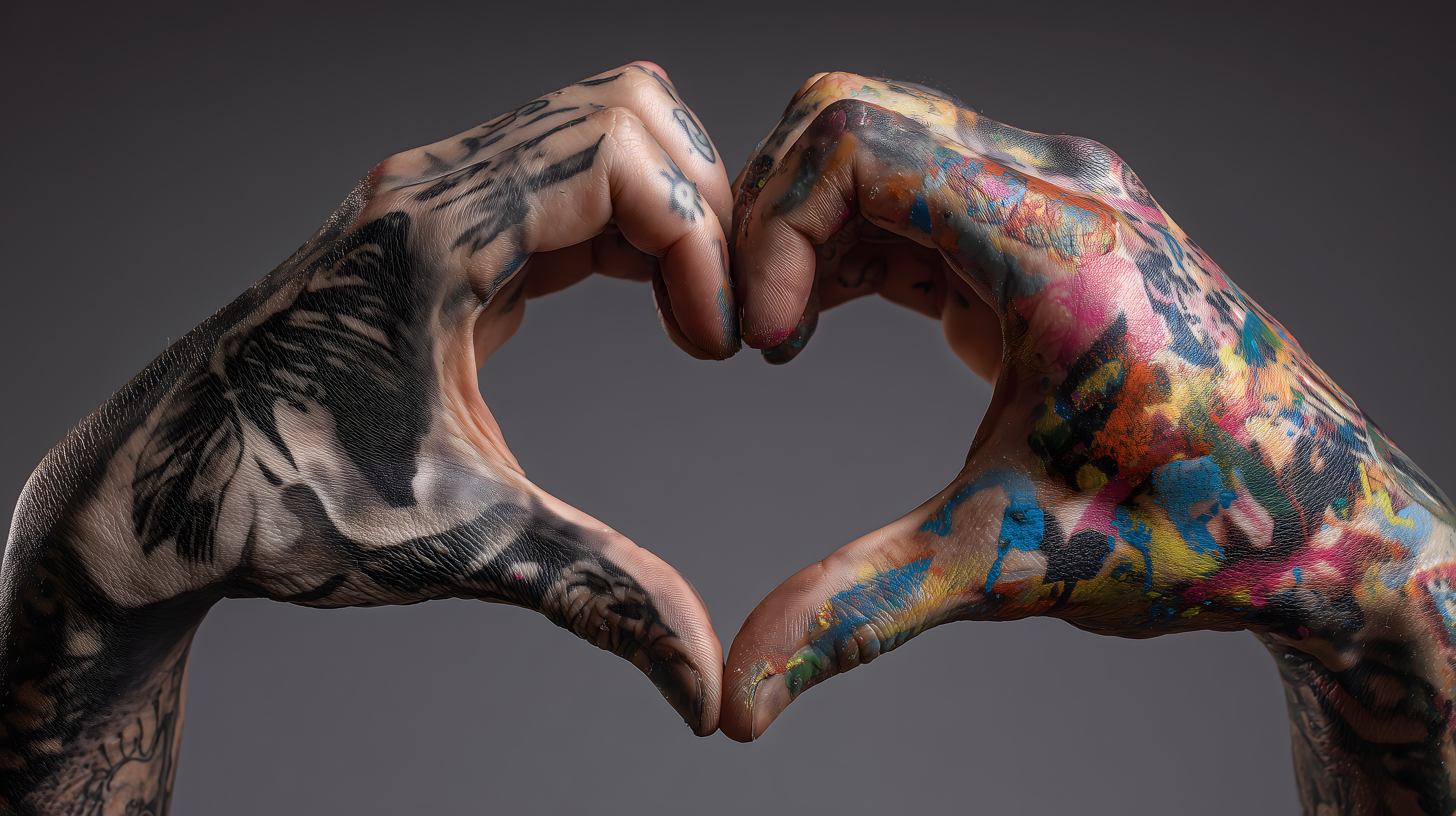 Dieses eindrucksvolle Foto zeigt zwei Hände, die eine Herzform formen. Die Hände sind mit farbenfrohen, grafischen Tattoos bedeckt, die einen künstlerischen und emotionalen Ausdruck verleihen. Das Bild strahlt eine Verbundenheit, Kreativität und Leidenschaft aus. Es eignet sich hervorragend als Stockfoto für Projekte in den Bereichen Liebe, Zusammenhalt, Ausdruck und Individualität. Das hochauflösende Foto ist unter einer Creative-Commons-Lizenz frei verwendbar.