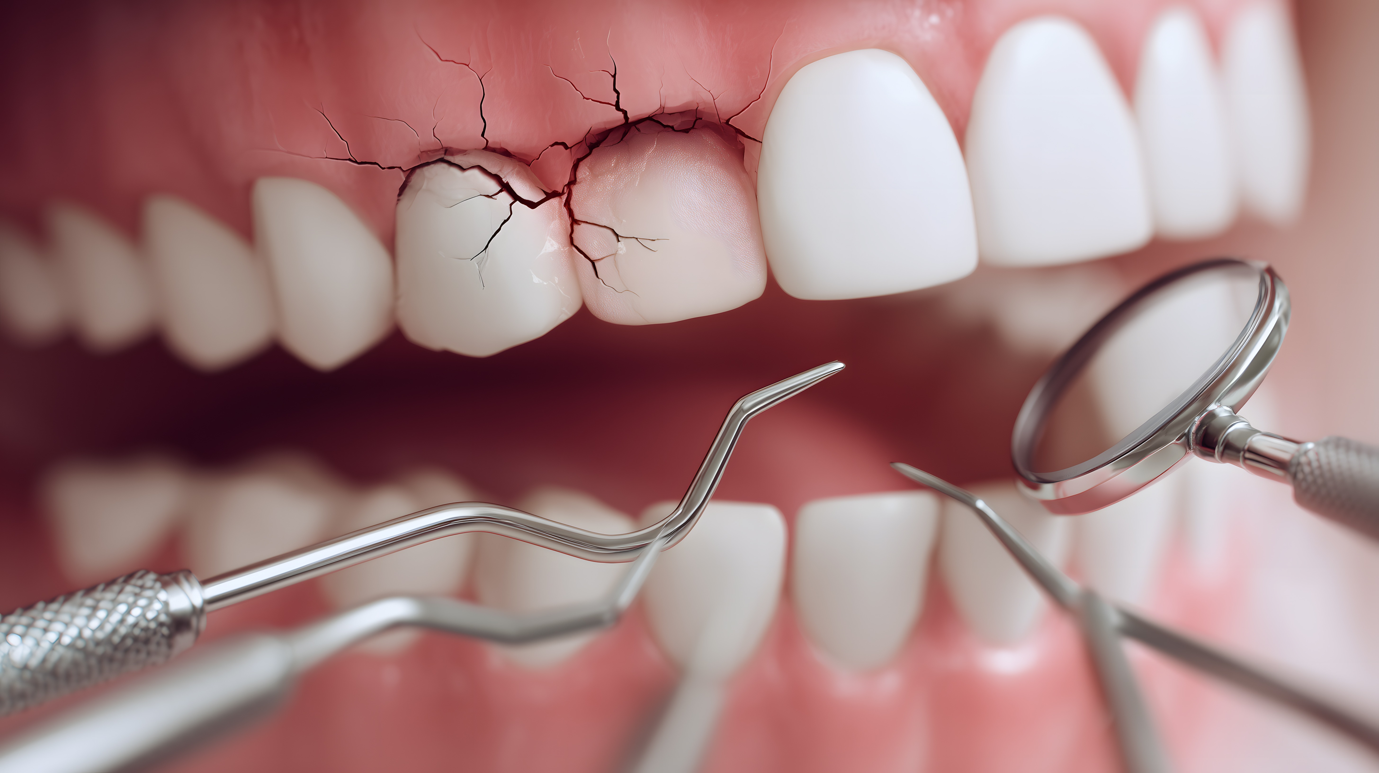 Dieses Foto zeigt eine Nahaufnahme von Zähnen mit Schäden und Rissen. Die Aufnahme hat einen rötlichen Farbton, der auf den entzündeten Zustand der Zähne hinweist. Im Vordergrund sind deutlich die Spitzen von medizinischen Instrumenten zu sehen, die für die Untersuchung und Behandlung der Zahnschäden verwendet werden. Dieses Stockfoto eignet sich hervorragend für Beiträge zu Themen wie Zahngesundheit, Dentalhygiene oder allgemeine Gesundheitsvorsorge, sei es in Blogs, Newslettern oder sozialen Medien. Es ist in hoher Auflösung und unter einer Creative-Commons-Lizenz verfügbar, sodass es kostenfrei genutzt werden kann.
