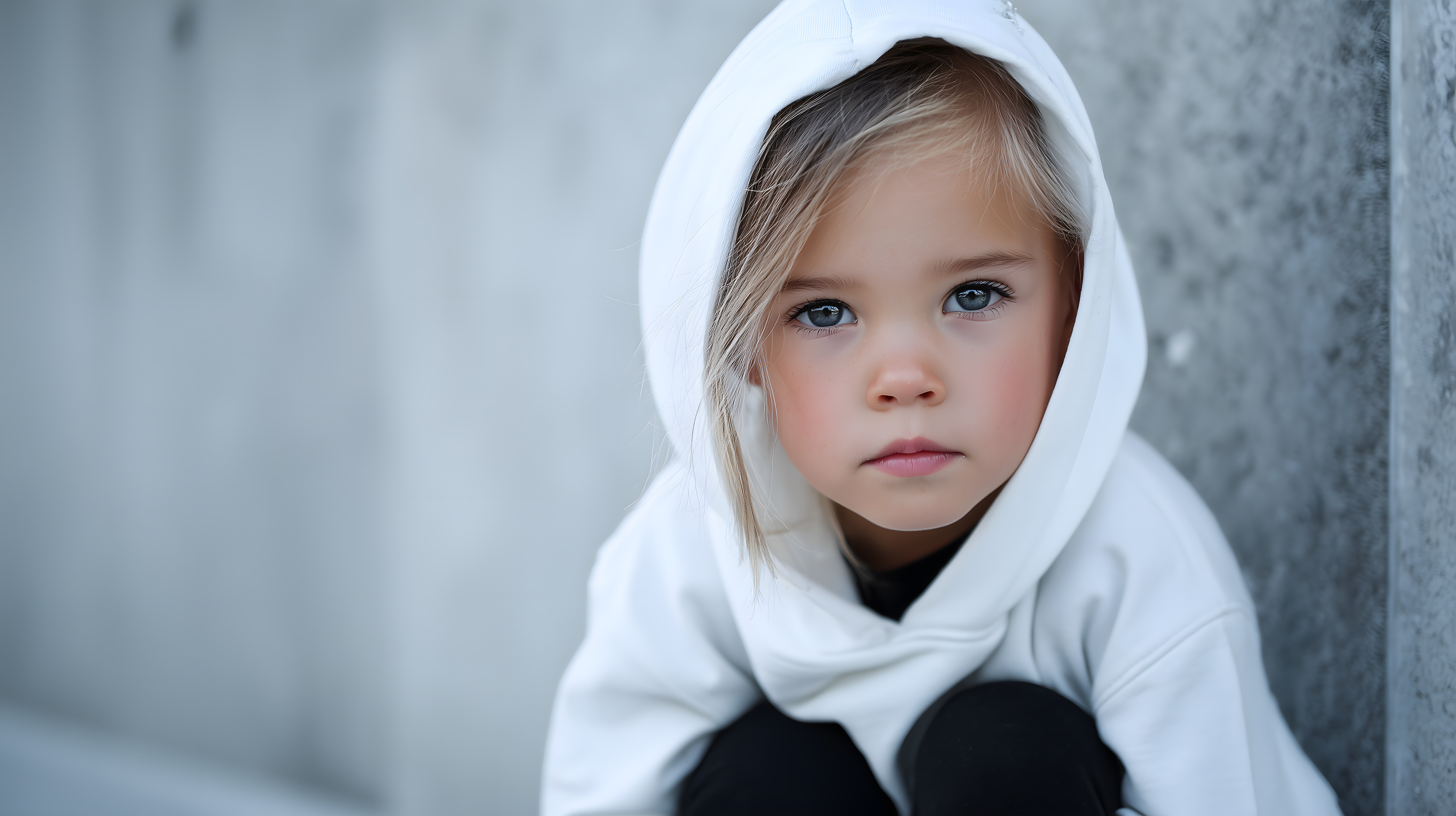 Das Bild zeigt ein junges, trauriges Mädchen, das in eine weiße Kapuze gehüllt ist. Der Fokus liegt auf ihrem ernsten Gesichtsausdruck, der eine Stimmung von Schwermut und Einsamkeit vermittelt. Die Aufnahme in Grautönen verstärkt diesen emotionalen Eindruck. Dieses Foto eignet sich hervorragend als Begleitung zu Themen wie Gefühlstiefe, Kindheit, Melancholie oder Sensibilität in Beiträgen, Newslettern oder sozialen Medien. Als hochaufgelöstes und kostenloses Stockfoto unter Creative-Commons-Lizenz kann es für verschiedenste Zwecke genutzt werden.