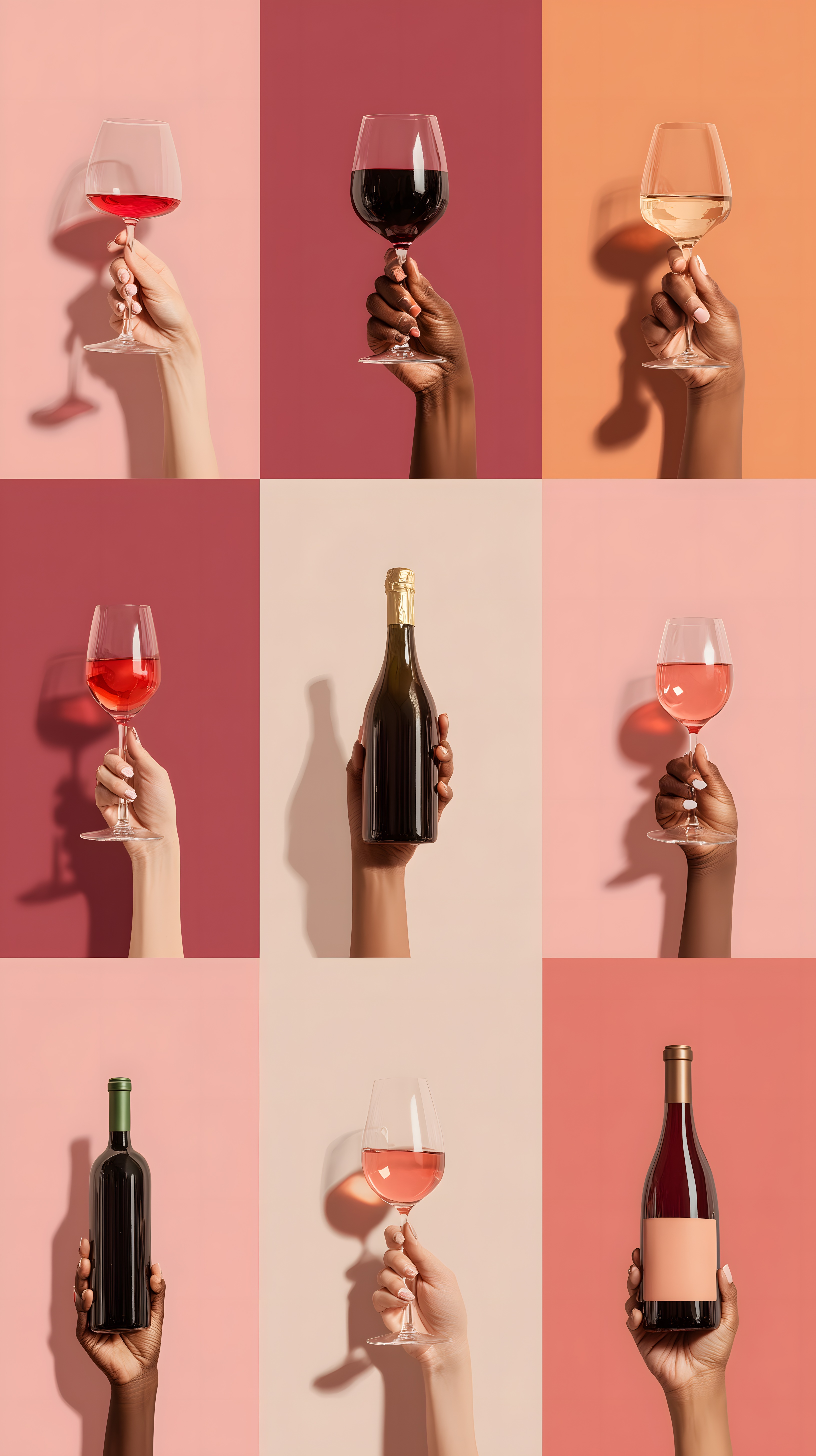 Dieses stimmungsvolle Foto inszeniert eine elegante Weinverkostung mit einer farbenfrohen, minimalistischen Ästhetik. Es zeigt Hände, die Weingläser in verschiedenen Rottönen halten, sowie Weinflaschen und Gläser in einem stimmungsvollen Ambiente aus kontrastierenden Farben wie Rosa, Rot und Orange.