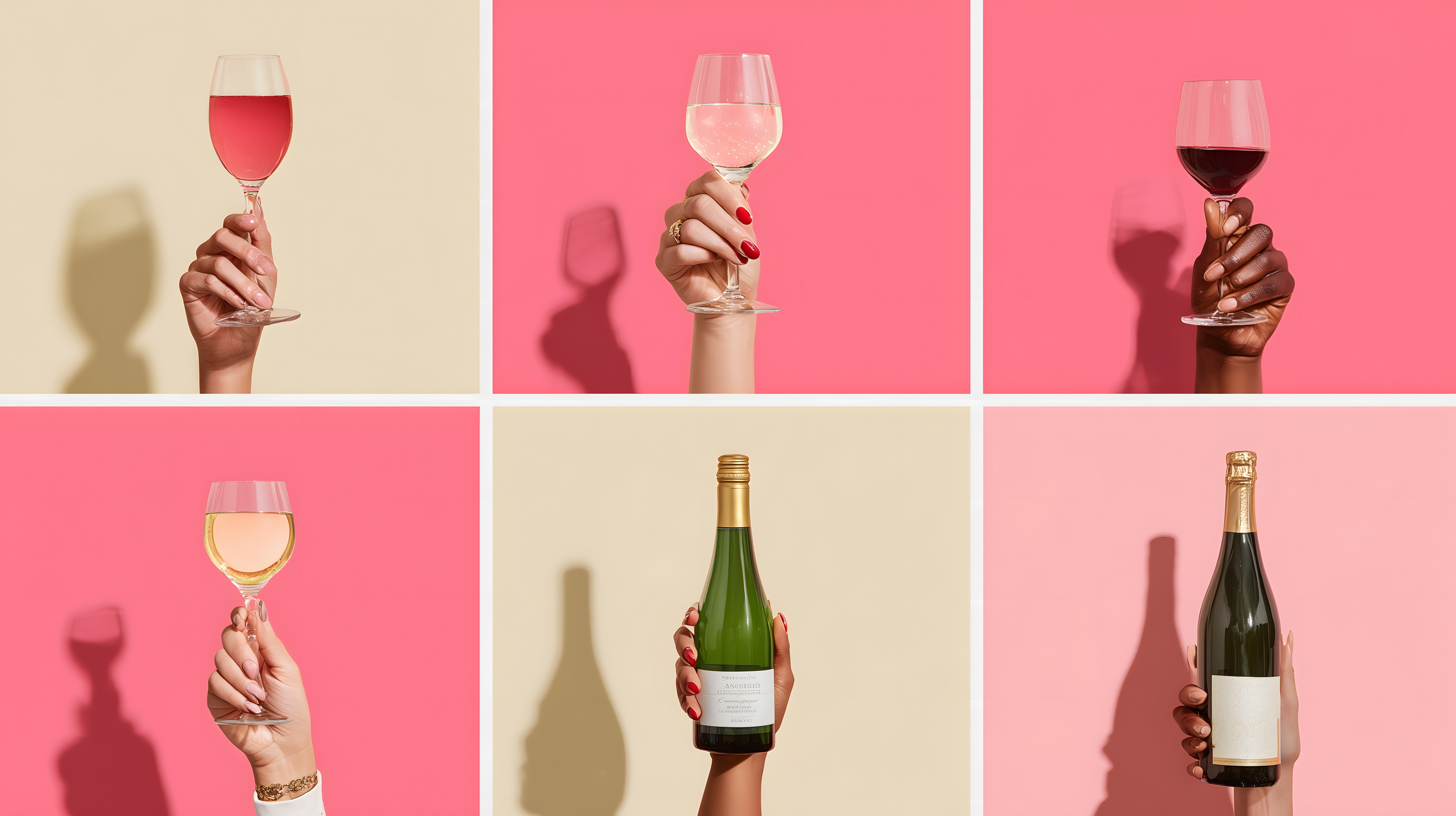 Dieses Stockfoto präsentiert eine bunte Weinverkostung mit modern gestalteten Weingläsern vor einem einfarbigen, pastellrosa Hintergrund. Die Hände halten verschiedene Weinarten, von Rosé über Weiß- bis hin zu Rotwein, in perfekt inszenierten Positionen. Das Bild stellt eine stilvolle und ästhetische Darstellung des Weingenusses dar und eignet sich ideal für den Einsatz in Werbe-, Marketing- oder Designkonzepten rund um das Thema Wein. In hoher Auflösung und unter Creative-Commons-Lizenz verfügbar, ist dieses Foto ein kostenloses Stockbild, das vielfältig eingesetzt werden kann.