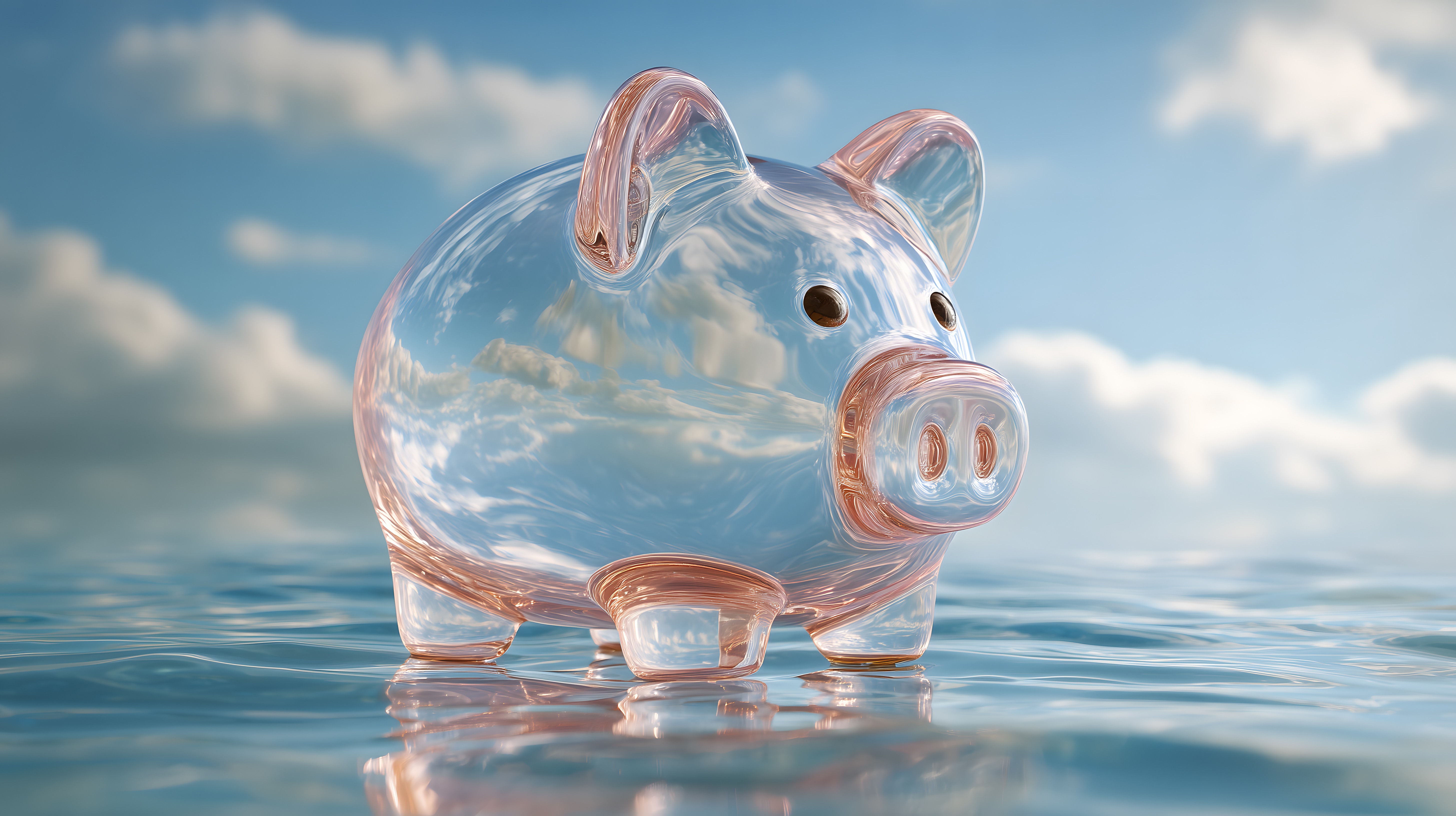 Das Bild zeigt ein transparentes, glänzendes Sparschwein, das halb im Wasser steht und die Wolken am Himmel und die Oberfläche des Wassers reflektiert. Das Sparschwein hat einen rosafarbenen Körper und Ohren, die im Kontrast zum klaren, glänzenden Glas stehen. Die Szene vermittelt ein Gefühl von Ruhe, Entspannung und finanzieller Sicherheit. Dieses Foto eignet sich perfekt als kostenloses Stockfoto für Blogbeiträge, Newsletter-Designs, Social-Media-Posts und Werbekampagnen im Bereich Finanzen, Geldanlage und Vermögensaufbau. Die Hochauflösung und die Creative-Commons-Lizenz ermöglichen eine vielseitige Verwendung des Bildes.