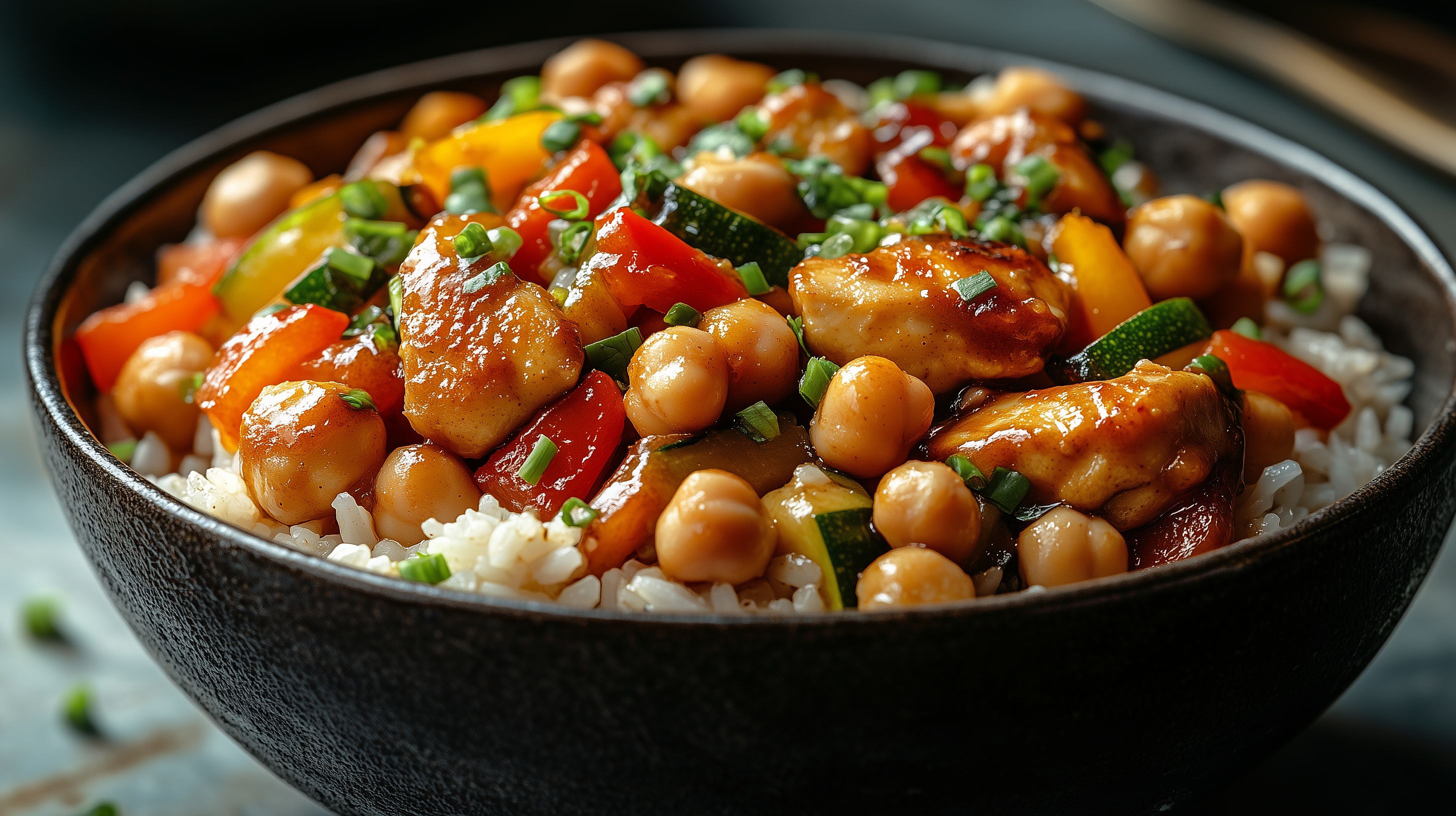 Dieses einladende Foto zeigt eine üppige Kichererbsen-Schüssel mit vielen frischen Zutaten. Im Mittelpunkt der Aufnahme befinden sich die goldbraunen Kichererbsen, die zusammen mit knackigem Gemüse wie Paprika, Zucchini und grünen Zwiebeln in einer dunklen Schüssel serviert werden. Das Gericht ist mit einer leckeren, würzigen Sauce übergossen und wird durch den weißen Reis ergänzt, der den Teller abrundet. Die sorgfältige Anordnung der Zutaten und die dunkle, kontrastreiche Beleuchtung machen das Foto zu einem appetitlichen und stimmungsvollen Blickfang, das sich ideal für den Einsatz in Blogs, Newslettern oder Social-Media-Beiträgen zum Thema gesunde und abwechslungsreiche Ernährung eignet. Dieses hochauflösende Stockfoto steht unter der Creative-Commons-Lizenz kostenlos für Ihre Projekte zur Verfügung.