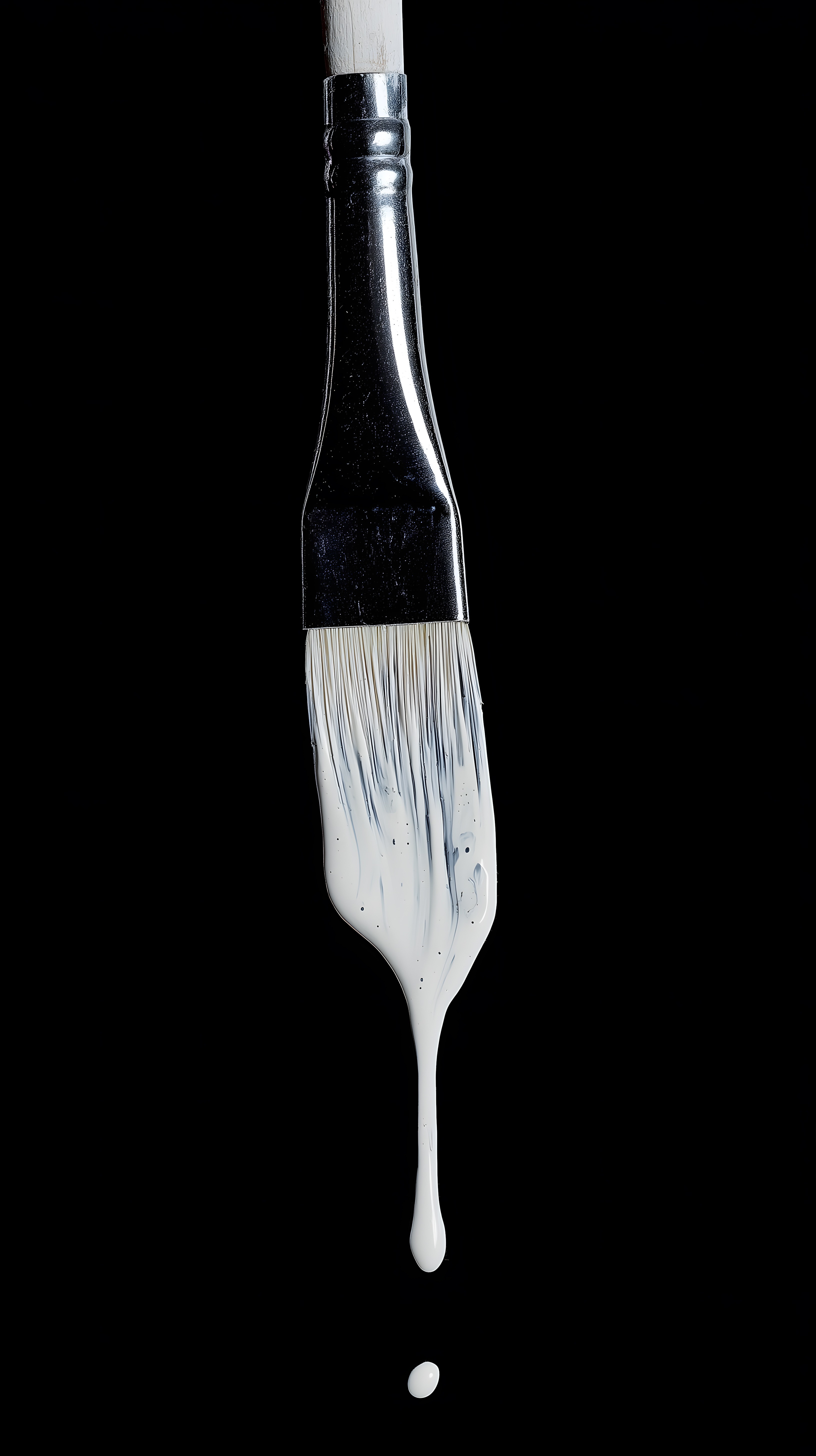 Dieses eindrucksvolle Foto zeigt einen Malerpinsel, dessen Borsten mit schwarzer Farbe benetzt sind. Der Pinsel steht vor einem dunklen, kontrastreichen Hintergrund, wodurch die Farbstruktur und Form des Pinsels besonders hervorgehoben werden. Die minimalistisch-abstrakte Komposition erzeugt eine fokussierte, kunstvolle Ästhetik.