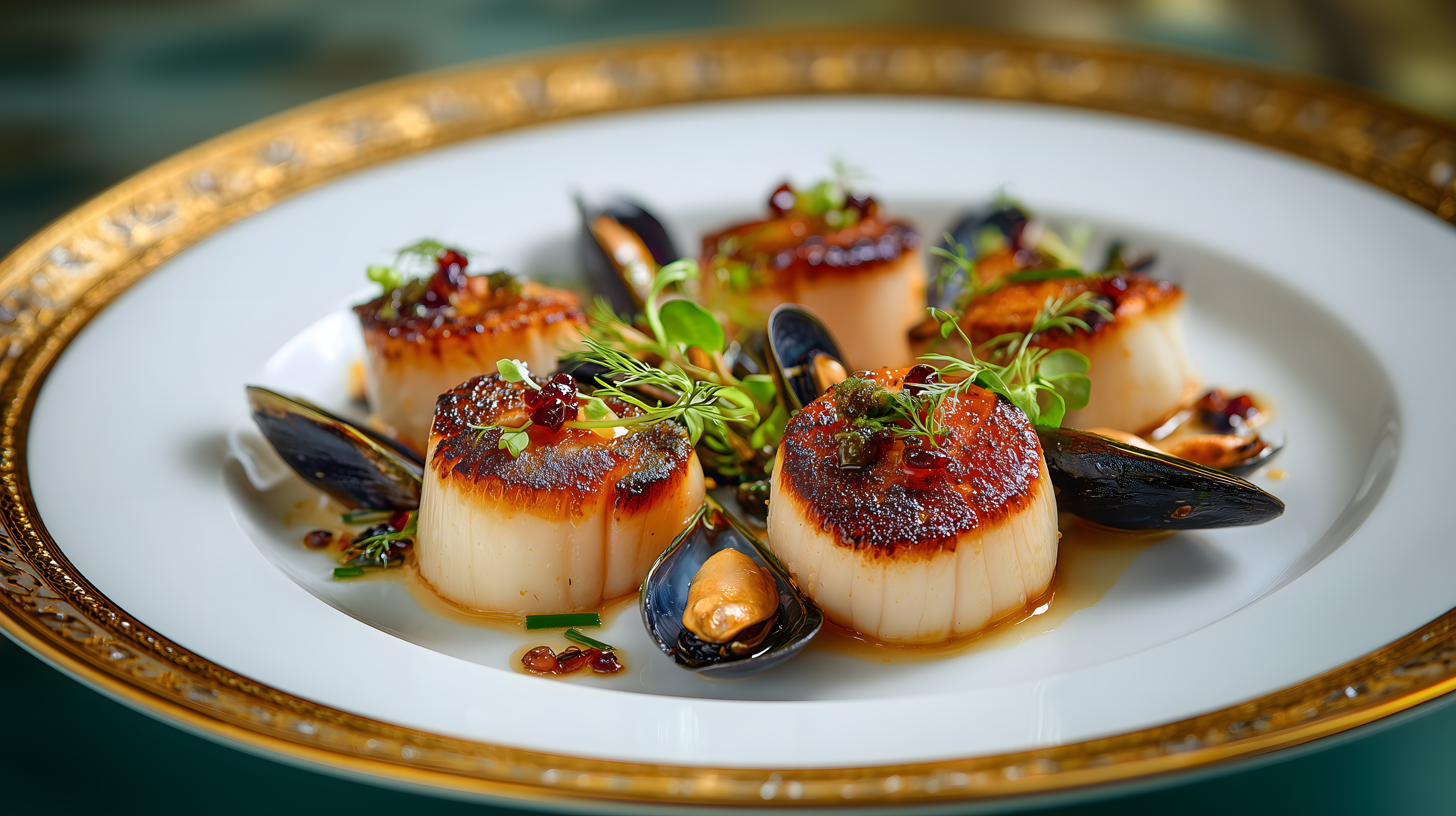 Das Bild zeigt ein aufwendig arrangiertes Gourmetgericht aus goldfarbigen Jahrmarktmuscheln, die perfekt in Szene gesetzt sind. Die Muscheln sind sorgfältig angerichtet und mit feinen Akzenten wie Kräutern und roten Beeren dekoriert. Der Teller ist in einem eleganten Vintage-Stil präsentiert, umgeben von einem goldfarbenen Rahmen, der das Gesamtbild stilvoll abrundet. Dieses hochwertige Stockfoto eignet sich hervorragend für kulinarische Blogs, Restaurantwebsites oder exklusive Werbekampagnen in hoher Auflösung und unter Creative-Commons-Lizenz.
