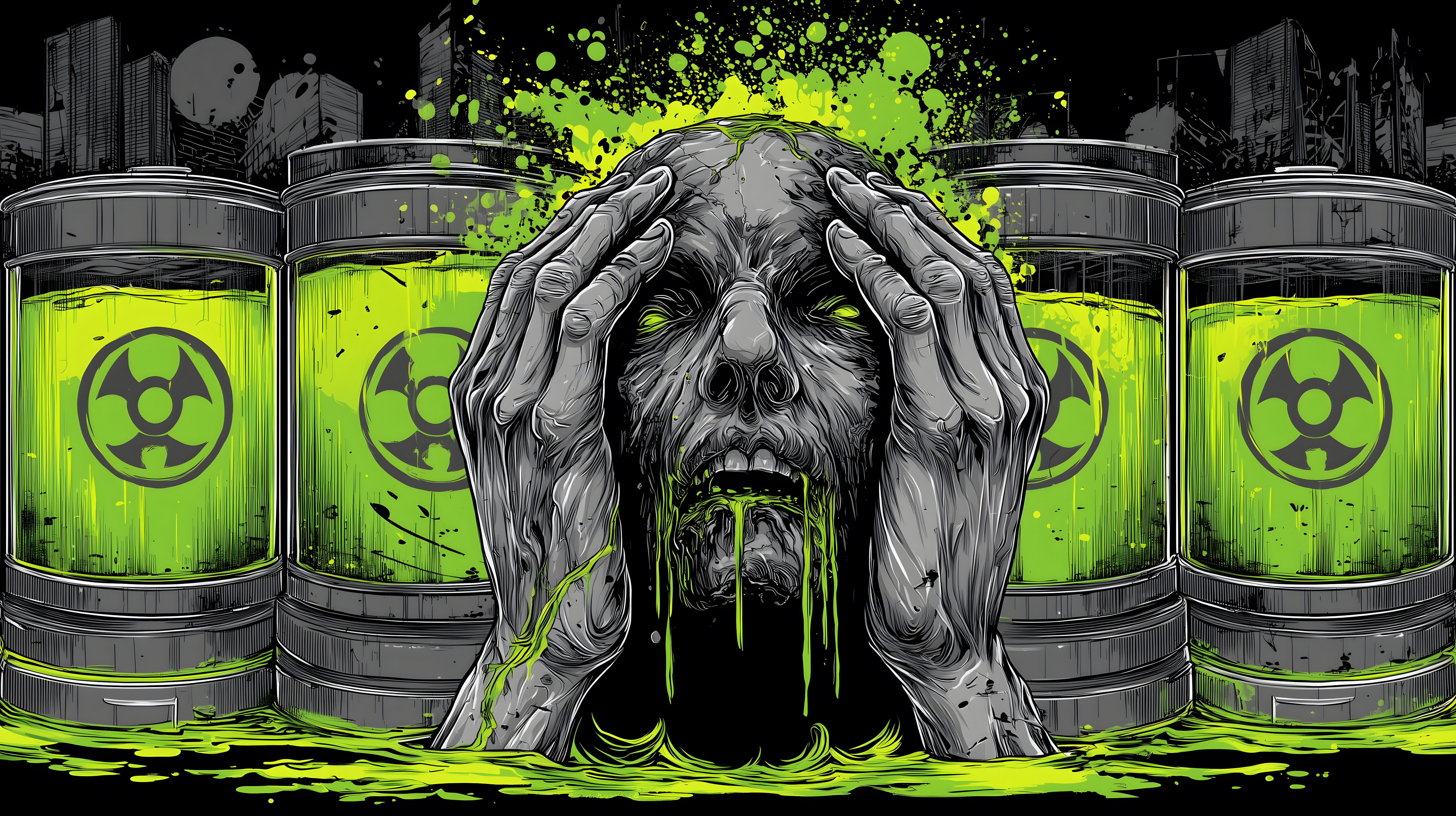 Dieses düstere, apokalyptische Grafikbild zeigt den Kopf einer zombieartigen Kreatur, die von ihren riesigen Händen bedeckt wird. Der Schädel scheint vor grünem, radioaktiv leuchtendem Gift oder Flüssigkeit zu triefen. Im Hintergrund sind große, silberne Gifttanks zu sehen, die ebenfalls ein grünliches Glühen ausstrahlen. Die Szenerie wirkt bedrohlich und lässt eine unheilvolle, postapokalyptische Stimmung aufkommen.