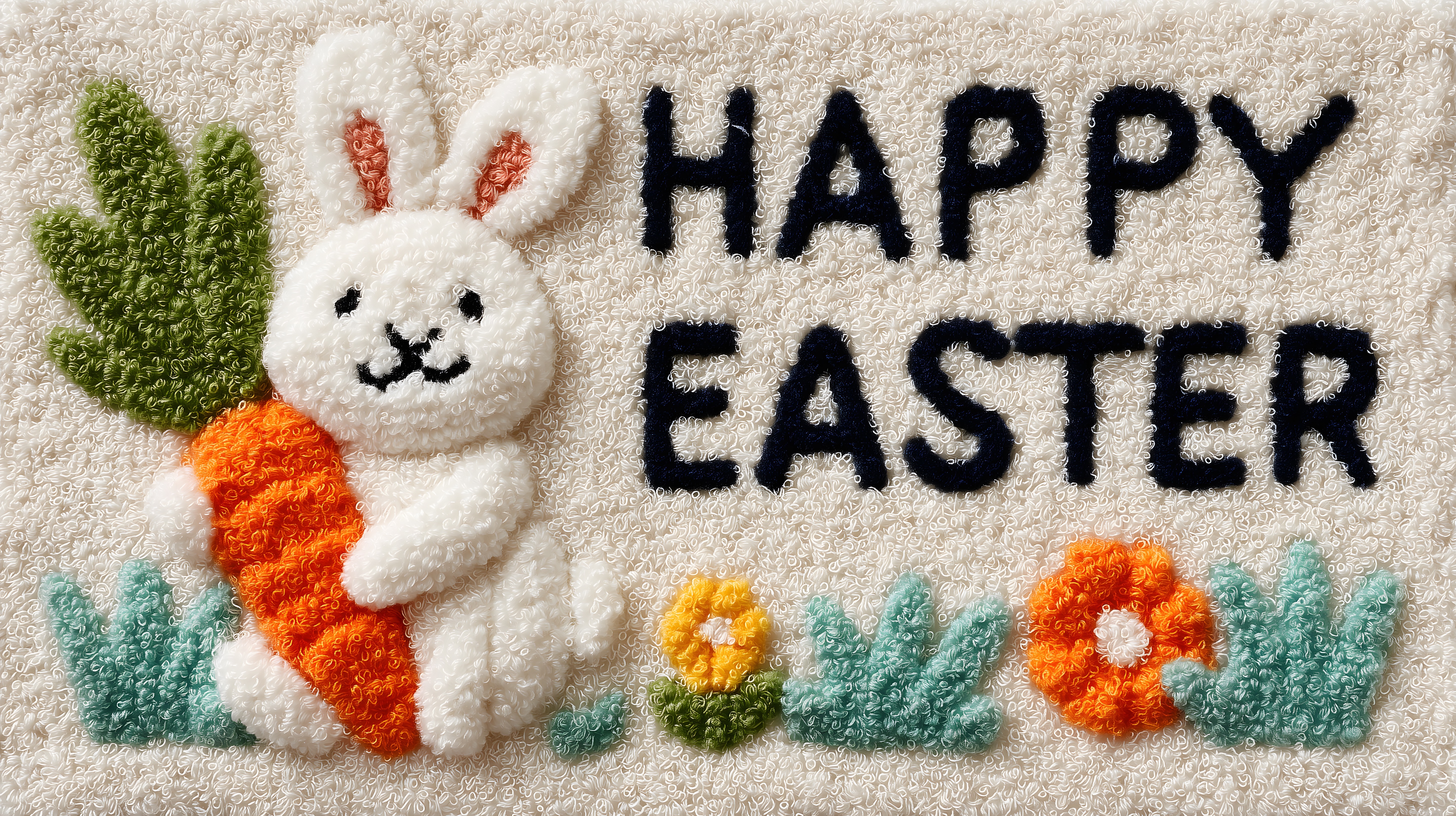 Dieses liebevoll gestaltete Bild zeigt eine Grußkarte mit einem weichen, flauschigen Osterhasen, der eine orange Karotte in der Pfote hält. Der Hintergrund ist mit detaillierten, gestrickten Elementen wie Blumen und Blättern verziert, die in pastellgrünen und orangen Farben gehalten sind. Die Worte 'HAPPY EASTER' sind in einer dunklen Schrift prominent platziert, was das Motiv als fröhlichen Gruß zum Osterfest präsentiert. Dieses stimmungsvolle Foto eignet sich hervorragend für Oster-Layouts, Einladungen, Werbekampagnen oder Dekorationen. Als kostenloses hochauflösendes Stockfoto unter Creative-Commons-Lizenz können Sie es vielseitig in Ihren Projekten einsetzen.