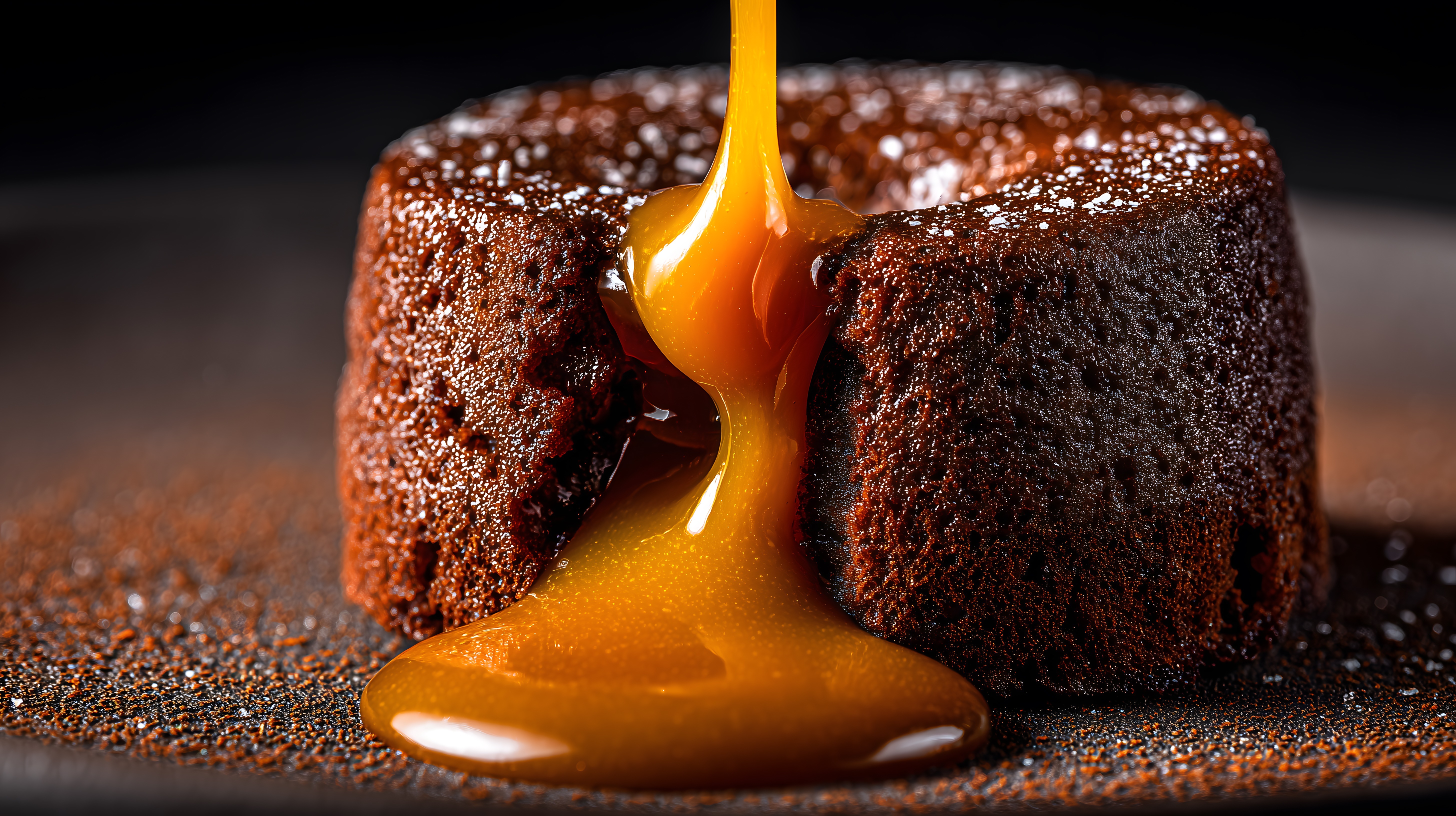 Dieses hochauflösende Bild zeigt einen frisch gebackenen Schokoladenkuchen mit einem flüssigen, karamellisierten Kern. Der Kuchen hat eine dunkle, glänzende Oberfläche, die von einem orangefarbenen Karamell-Topping durchbrochen wird. Das Foto ist perfekt für den Einsatz in Blogs, Newslettern, Social-Media-Beiträgen oder Werbematerialien rund um das Thema Backen, Desserts und kulinarische Genüsse. Als kostenloses Stockfoto in hoher Auflösung und unter Creative-Commons-Lizenz stehend, lässt es sich vielfältig und rechtssicher nutzen.