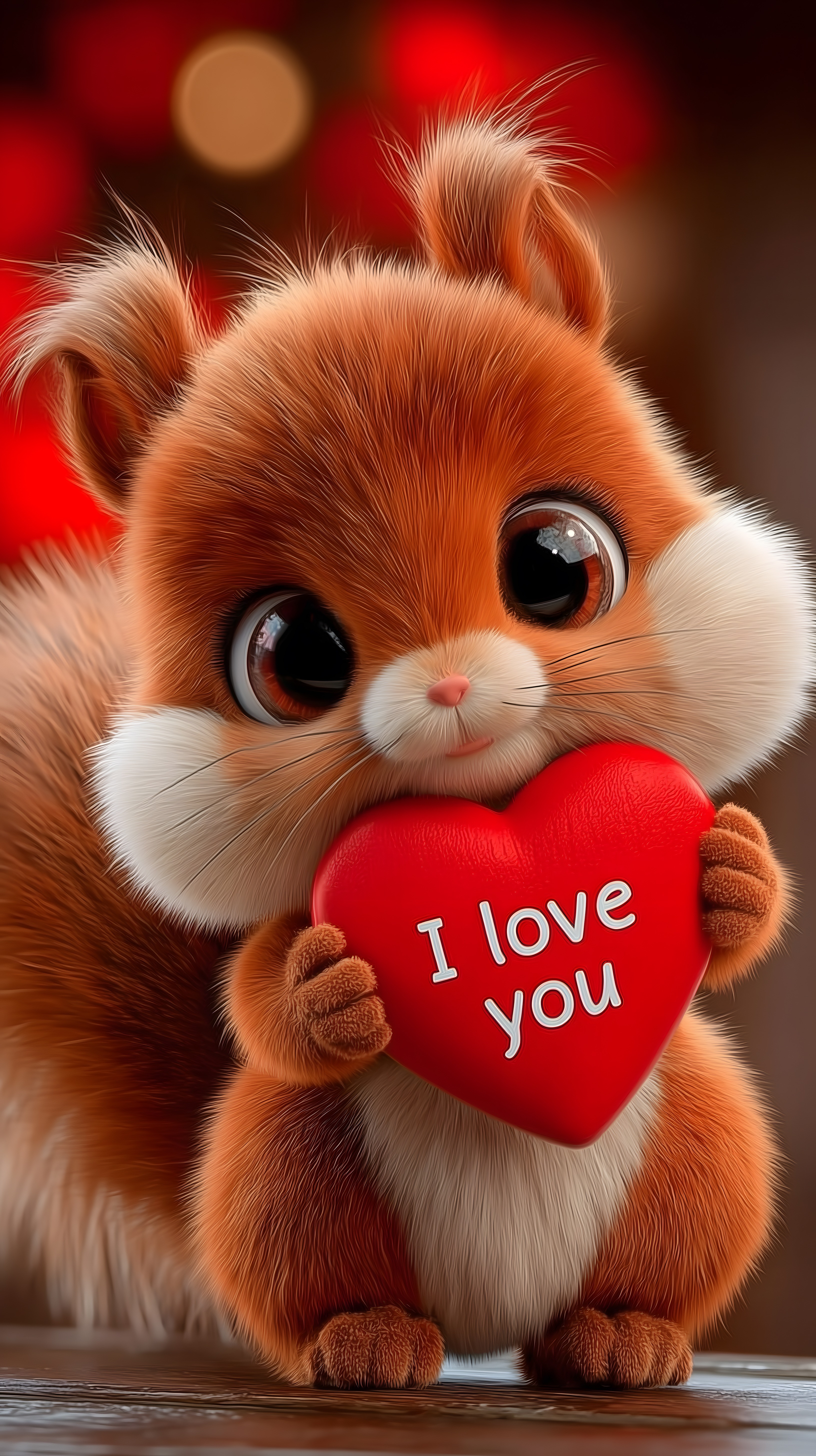 Das Foto zeigt ein niedliches Eichhörnchen, das ein rotes Herz mit der Aufschrift 'I love you' in seinen Pfötchen hält. Das flauschige Nagetier blickt mit großen, ausdrucksstarken Augen direkt in die Kamera und versprüht so eine emotionale, liebevolle Ausstrahlung. Die rote Umgebung verleiht dem Bild einen romantischen, festlichen Charakter, der es ideal für Valentinstag-Motive, Geschenk-Illustrationen oder Liebesgrüße macht. Das hochauflösende Stockfoto kann unter einer kostenlosen Creative-Commons-Lizenz genutzt werden.