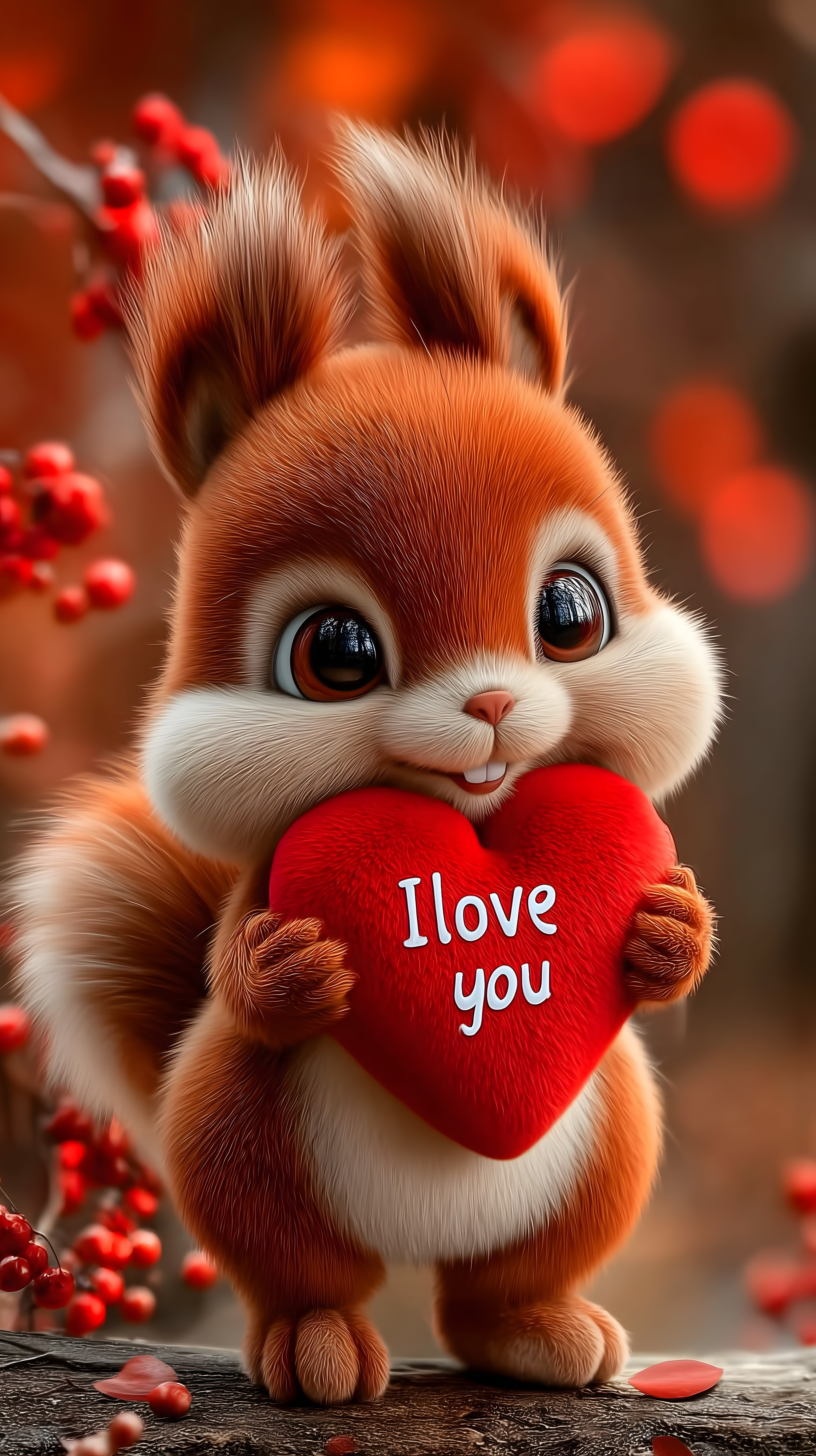Das Bild zeigt ein süßes Eichhörnchen, das ein rotes Herz mit der Aufschrift 'I love you' hält. Das Eichhörnchen hat einen runden, kuscheligen Körper, große Augen und ein freundliches Lächeln. Es steht inmitten roter Beeren vor einem unscharfen, bräunlichen Hintergrund, der eine romantische, stimmungsvolle Atmosphäre schafft. Dieses Foto eignet sich perfekt als kostenloses Stockfoto für Liebesgrüße, Valentinstag-Werbung, soziale Medien oder andere romantische Anwendungen in hoher Auflösung unter Creative-Commons-Lizenz.