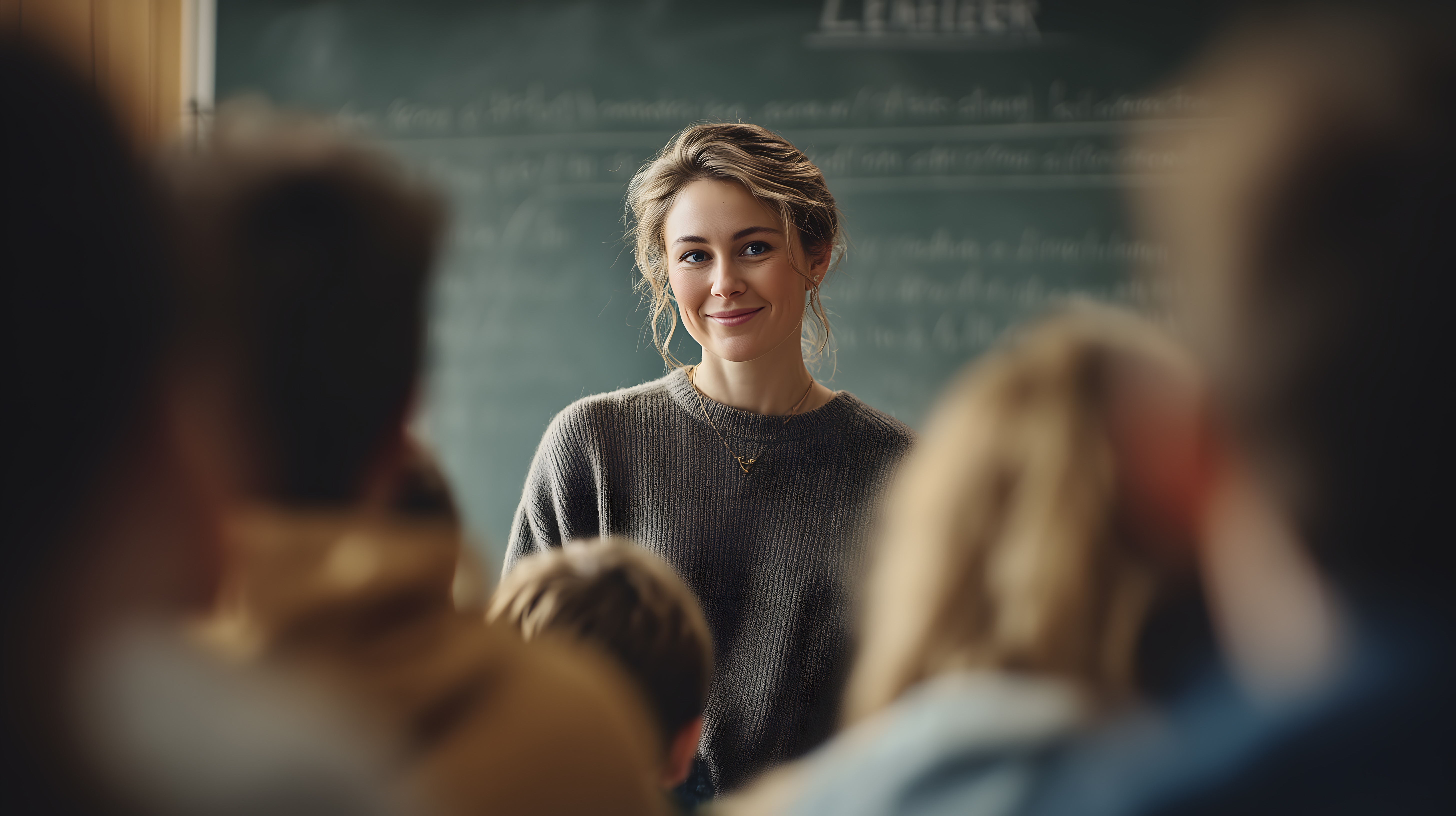 Das Foto zeigt eine Lehrerin, die lächelnd vor einer Gruppe von Schülern im Klassenzimmer steht. Sie trägt einen grauen Pullover und ihre blonden Haare sind zu einem lockeren Dutt zusammengebunden. Die Schüler sitzen an ihren Pulten und blicken konzentriert auf die Lehrerin. Im Hintergrund ist eine grüne Tafel zu sehen, auf der Notizen geschrieben stehen. Das Foto vermittelt einen ruhigen und konzentrierten Eindruck des Unterrichtsgeschehens. Es eignet sich hervorragend als hochwertiges Stockfoto für Blogbeiträge, Newsletter oder Social-Media-Kanäle rund um die Themen Bildung, Pädagogik und Lehre. Das Foto ist in hoher Auflösung verfügbar und unter einer Creative-Commons-Lizenz nutzbar.
