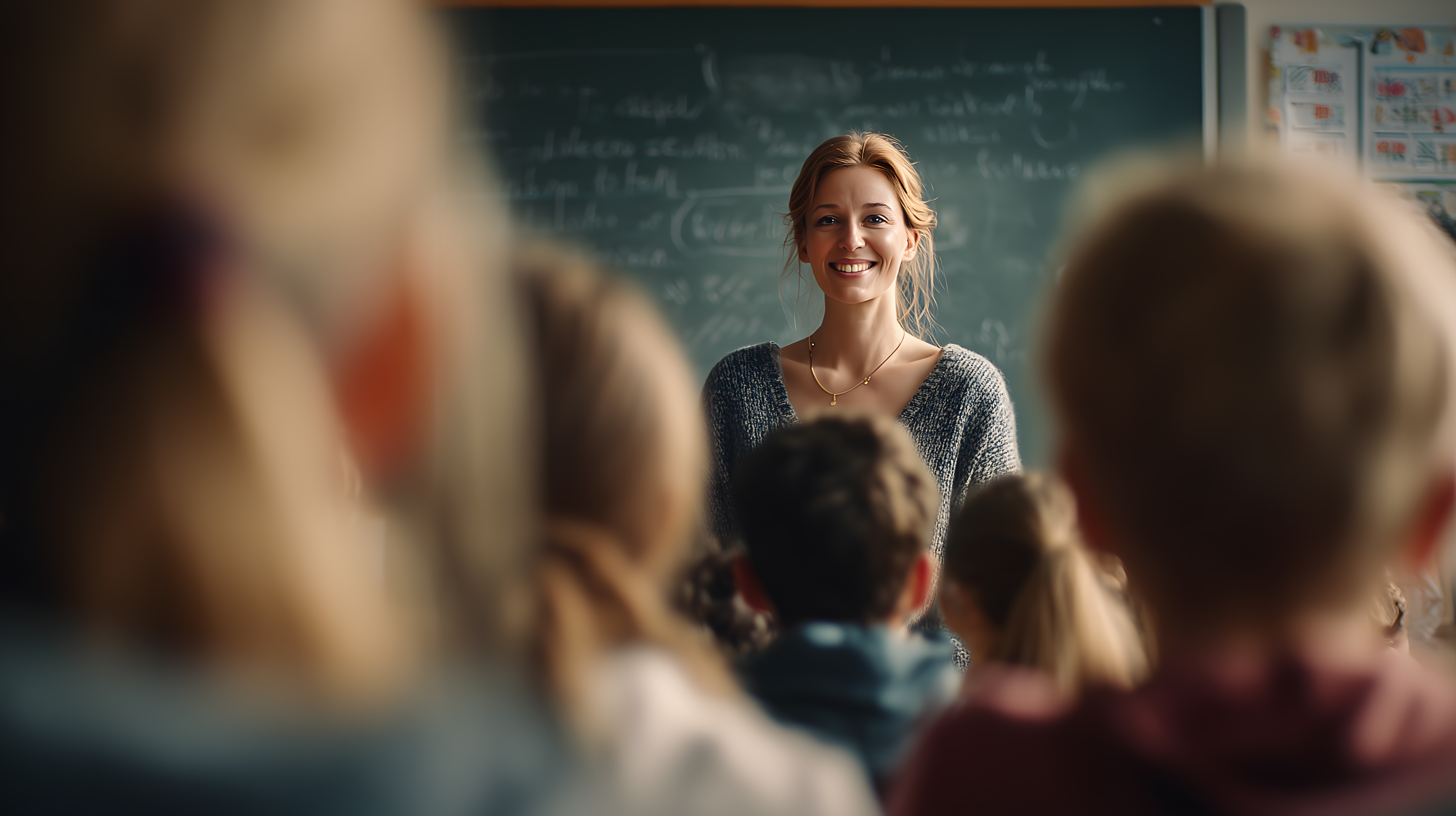 Das Bild zeigt eine junge, lächelnde Lehrerin, die vor einer Tafel im Klassenzimmer steht und ihre Schüler anschaut. Die Lehrerin trägt einen grauen Pullover und hat lange, blonde Haare. Hinter ihr ist eine grüne Tafel zu sehen, auf der Notizen und Diagramme zu erkennen sind. Im Vordergrund sitzen die Schüler, deren Gesichter jedoch nicht deutlich zu erkennen sind. Das Bild vermittelt eine positive, offene Atmosphäre im Klassenzimmer und könnte für Schulwebseiten, Bildungsmaterialien oder Social-Media-Beiträge zum Thema Lehre und Pädagogik verwendet werden. Es ist ein hochauflösendes, kostenloses Stockfoto unter Creative-Commons-Lizenz.