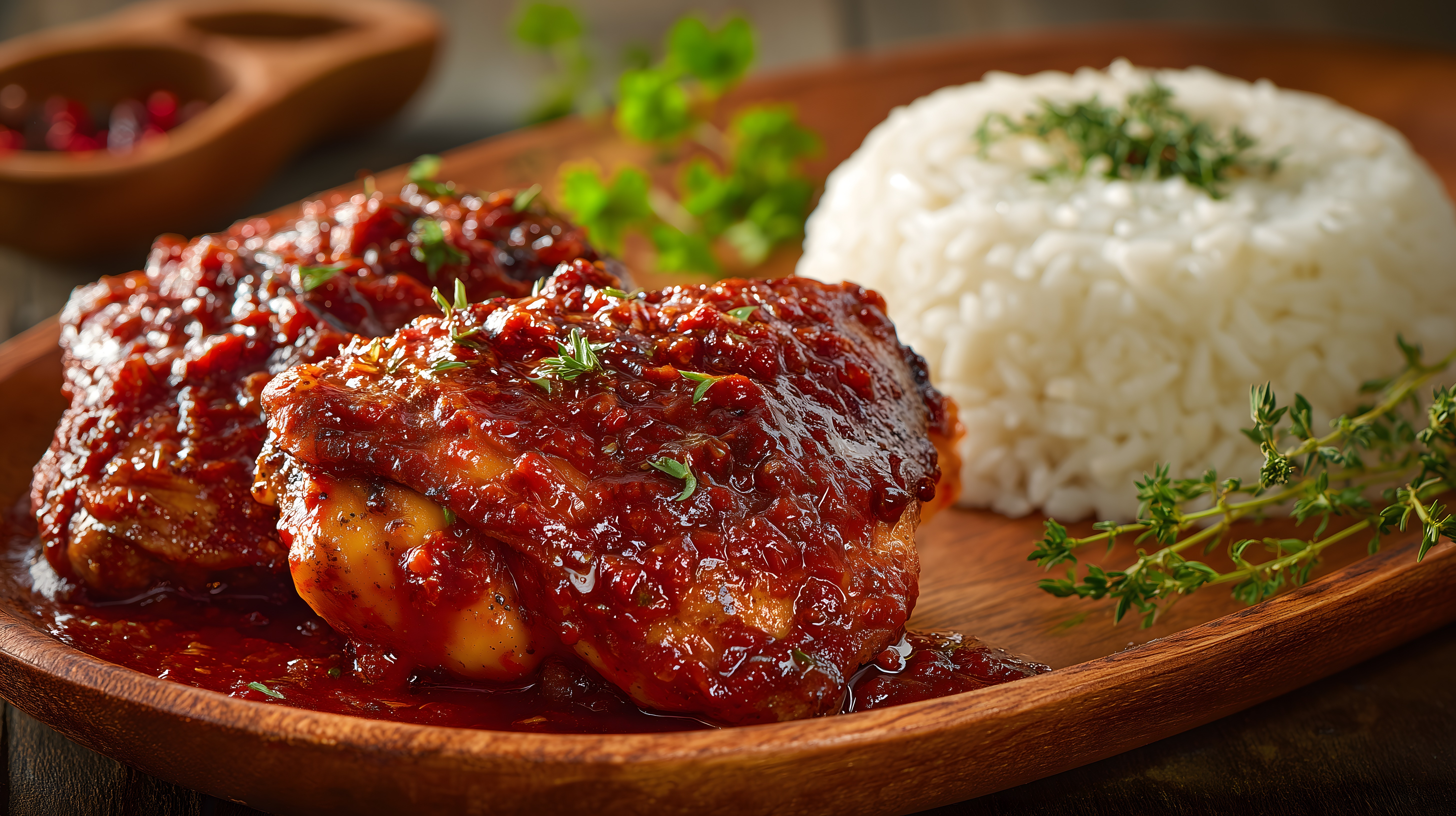 Das Foto zeigt ein leckeres Hühnchen-Gericht in einer würzigen Tomatensauce, serviert auf einer rustikalen Holzplatte mit Reis und frischen Kräutern. Die Farbpalette aus Rot, Weiß und Grün schafft eine appetitliche und stimmungsvolle Atmosphäre. Dieses hochwertige Stockfoto eignet sich hervorragend für Blogs, Newsletter, Social-Media-Beiträge oder Werbezwecke im Bereich Kochen, Gastronomie und Kulinarik. Es ist in hoher Auflösung und unter einer Creative-Commons-Lizenz frei nutzbar.