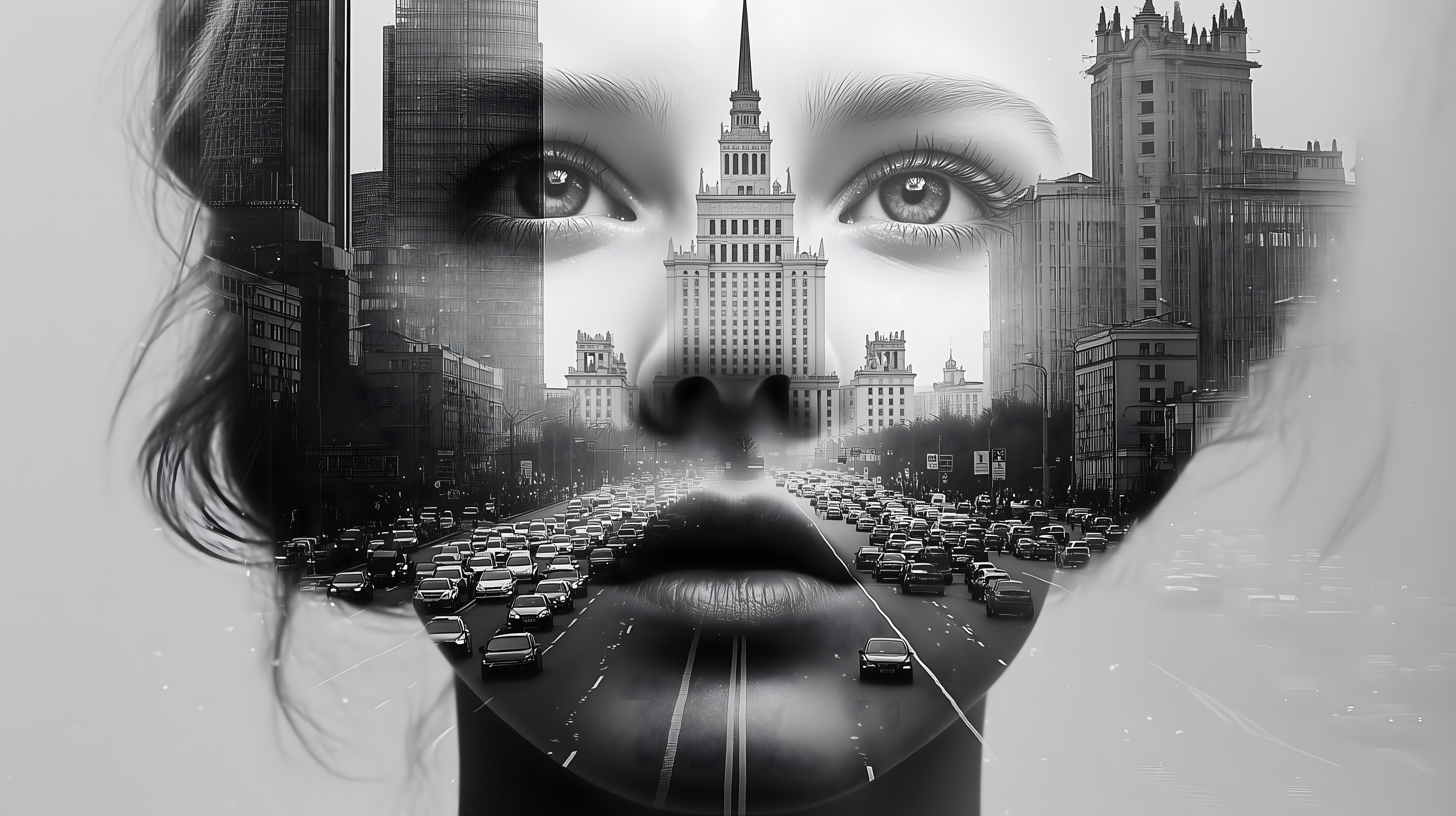 Dieses beeindruckende Schwarz-Weiß-Foto zeigt ein surrealistisches Stadtporträt. Im Mittelpunkt ist ein Gesicht mit intensiven Augen und markanten Lippen zu sehen, das gleichzeitig von Hochhäusern und einer belebten Stadtautobahn umgeben ist. Die Komposition und der starke Kontrast verleihen dem Bild eine künstlerische, fast grafische Anmutung.