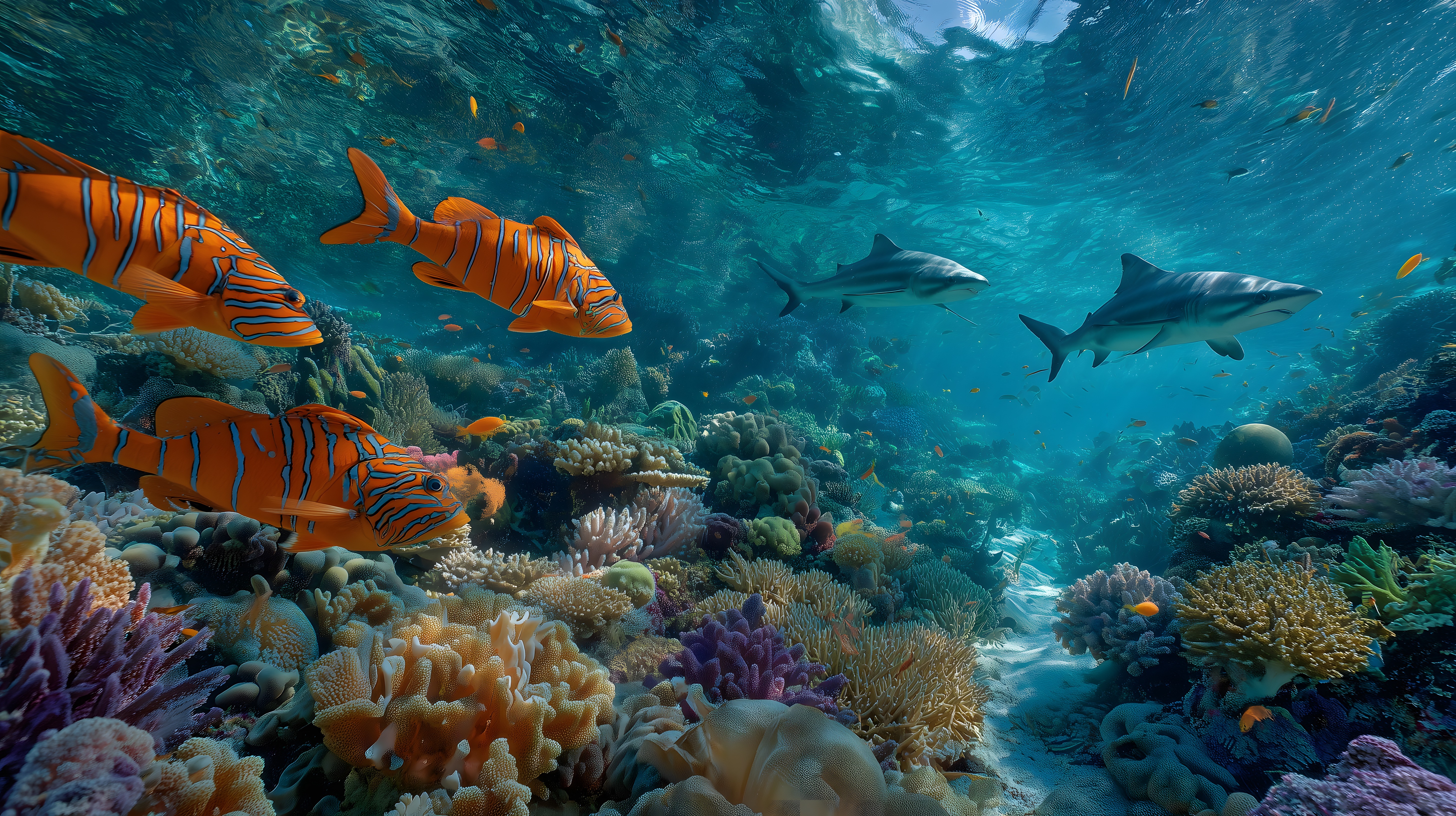 Dieses farbenfrohe Unterwasserfoto zeigt ein tropisches Korallenriff, in dem verschiedene Meeresbewohner wie bunte Mandarinfische und Haie friedlich zusammenleben. Die Perspektive aus der Unterwasserwelt lässt den Betrachter eintauchen in eine faszinierende Unterwasserwelt voller Leben und Schönheit. Das hochauflösende Bild eignet sich perfekt als kostenloses Stockfoto für Blogs, Newsletter, Social-Media-Kanäle oder kreative Werbemittel, da es unter einer Creative-Commons-Lizenz veröffentlicht wurde und frei verwendet werden kann.