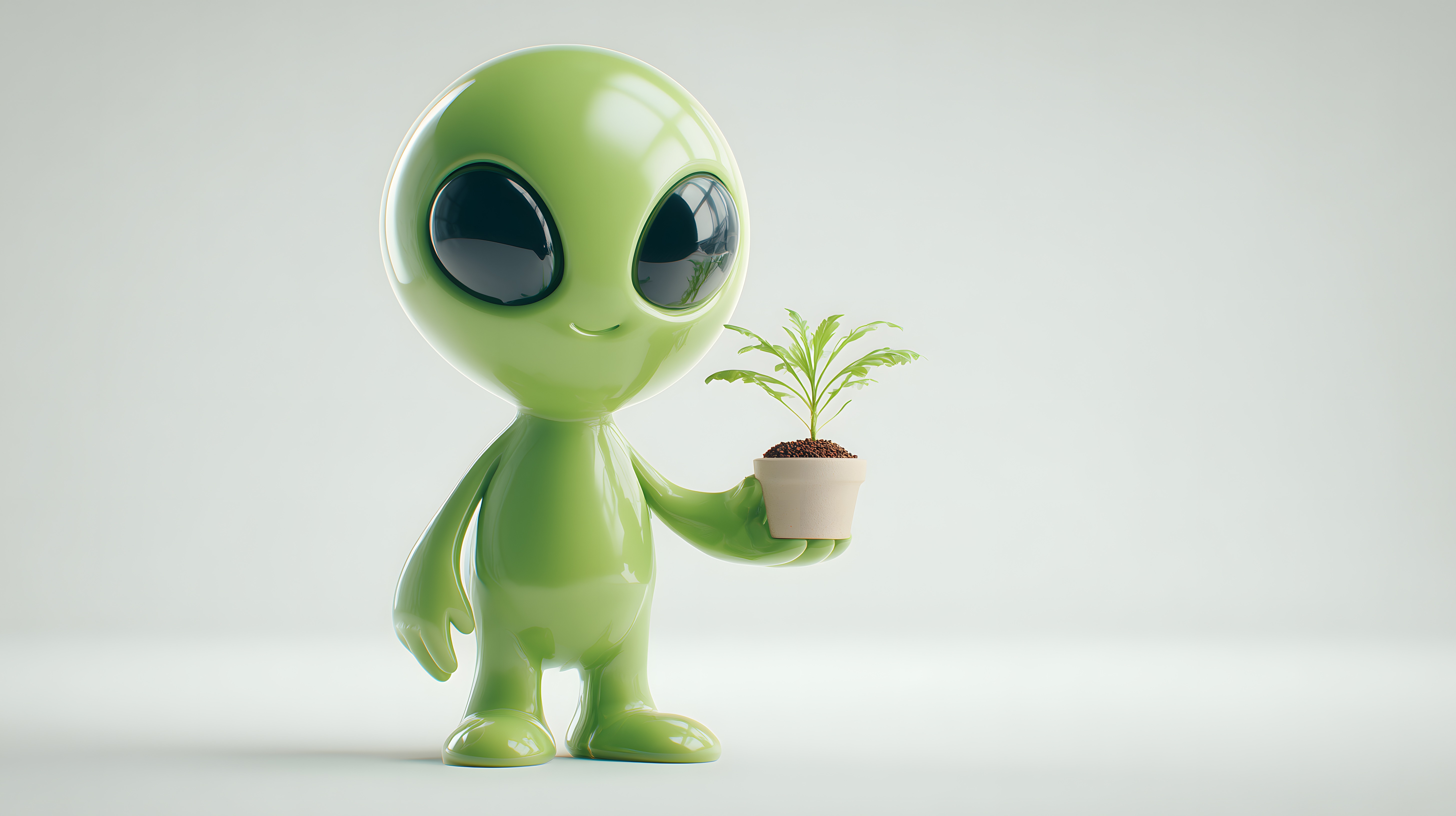 Das Bild zeigt einen niedlichen, grünen Alien-Charakter, der eine kleine Pflanze in einem Blumentopf in den Händen hält. Der Alien hat große, schwarze Augen und einen freundlichen, fröhlichen Gesichtsausdruck. Der Hintergrund ist einfarbig, was den Fokus auf den Alien-Charakter und die Pflanze lenkt. Dieses kostenlose Stockfoto in hoher Auflösung eignet sich hervorragend für Verwendungen in Blogs, Newslettern, Social Media-Posts oder Werbematerial, bei denen ein fantasie- und humorvoller Akzent gesetzt werden soll. Die Illustration ist unter Creative Commons-Lizenz frei nutzbar.