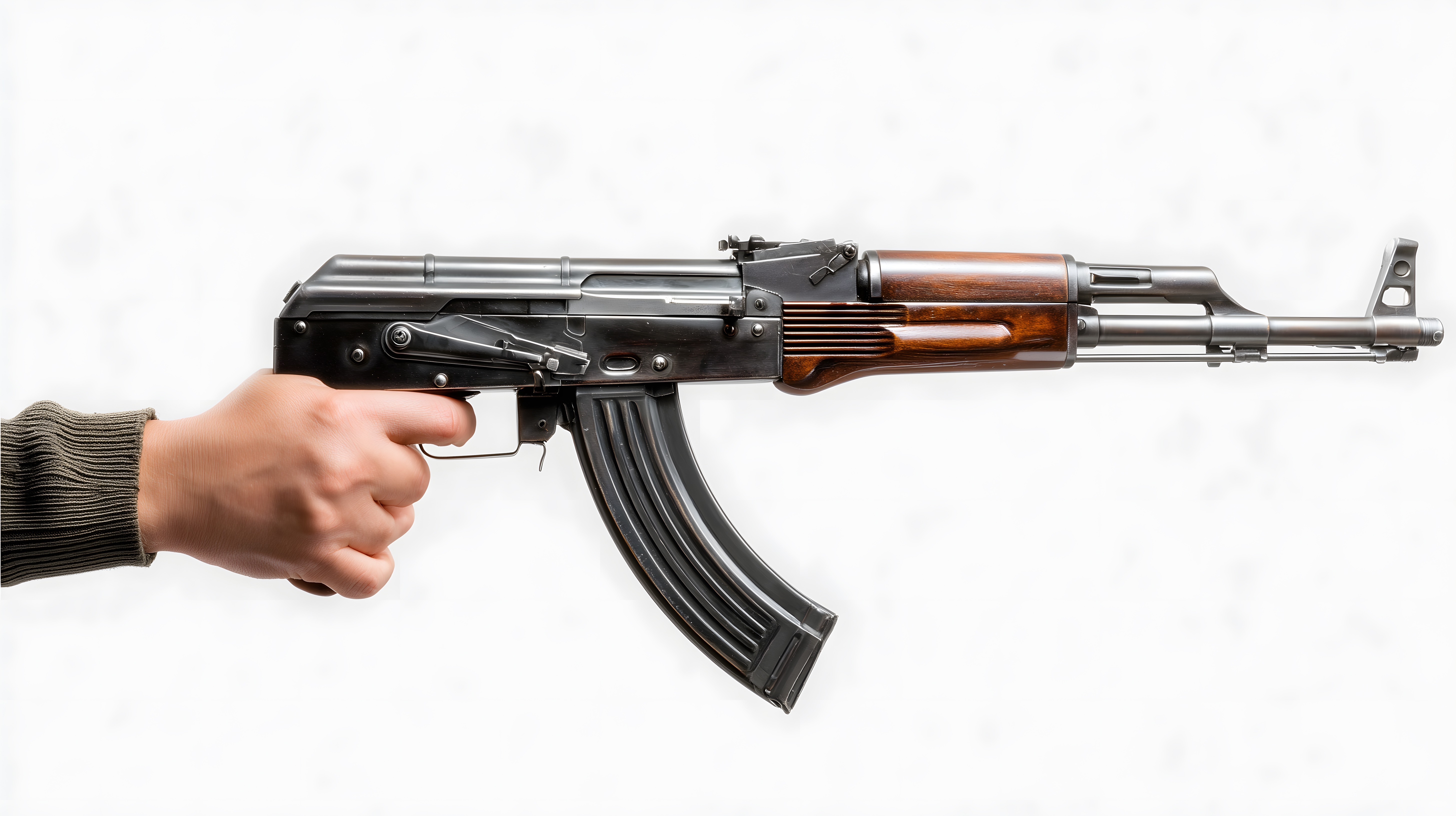 Das Bild zeigt eine Nahaufnahme einer automatischen Waffe, die von einer Hand gehalten wird. Die Waffe ist vor einem weißen Hintergrund positioniert, was den Fokus auf das Objekt selbst lenkt. Das Gewehr ist schwarz und hat einen hölzernen Schaft, was auf ein klassisches Design hinweist. Das Foto kann für verschiedene Zwecke verwendet werden, wie etwa in Artikeln über Waffengesetzgebung, Militärgeschichte oder Sicherheitsthemen. Es ist ein kostenloses Stockfoto in hoher Auflösung, das unter einer Creative-Commons-Lizenz verfügbar ist.