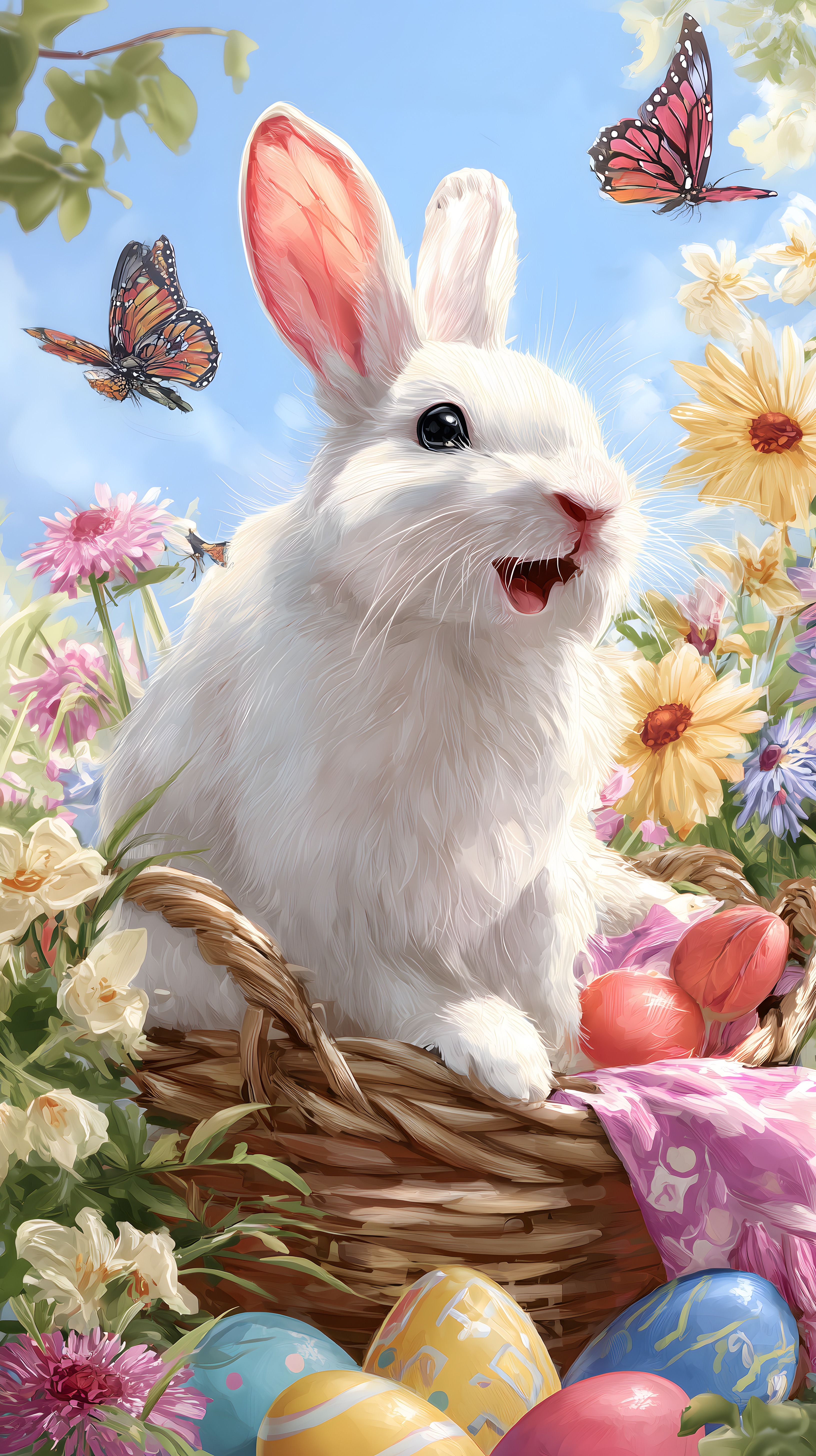 Dieses charmante Foto zeigt einen süßen, flauschigen Osterhasen, der in einem Blumenkorb sitzt, umgeben von bunten Ostereiern und farbenfrohen Frühlingsblumen. Der weiße Hase mit rosafarbenen Ohren blickt fröhlich in die Kamera, während Schmetterlinge um ihn herumschweben. Die Illustration im pastelligen Stil vermittelt eine idyllische und gemütliche Atmosphäre, perfekt geeignet für Osterkarten, Blogbeiträge, Social-Media-Postings oder Werbematerialien rund um den Frühling und das Osterfest. Dieses hochwertige Stockfoto in hoher Auflösung steht unter einer Creative-Commons-Lizenz zur kostenlosen Verwendung zur Verfügung.
