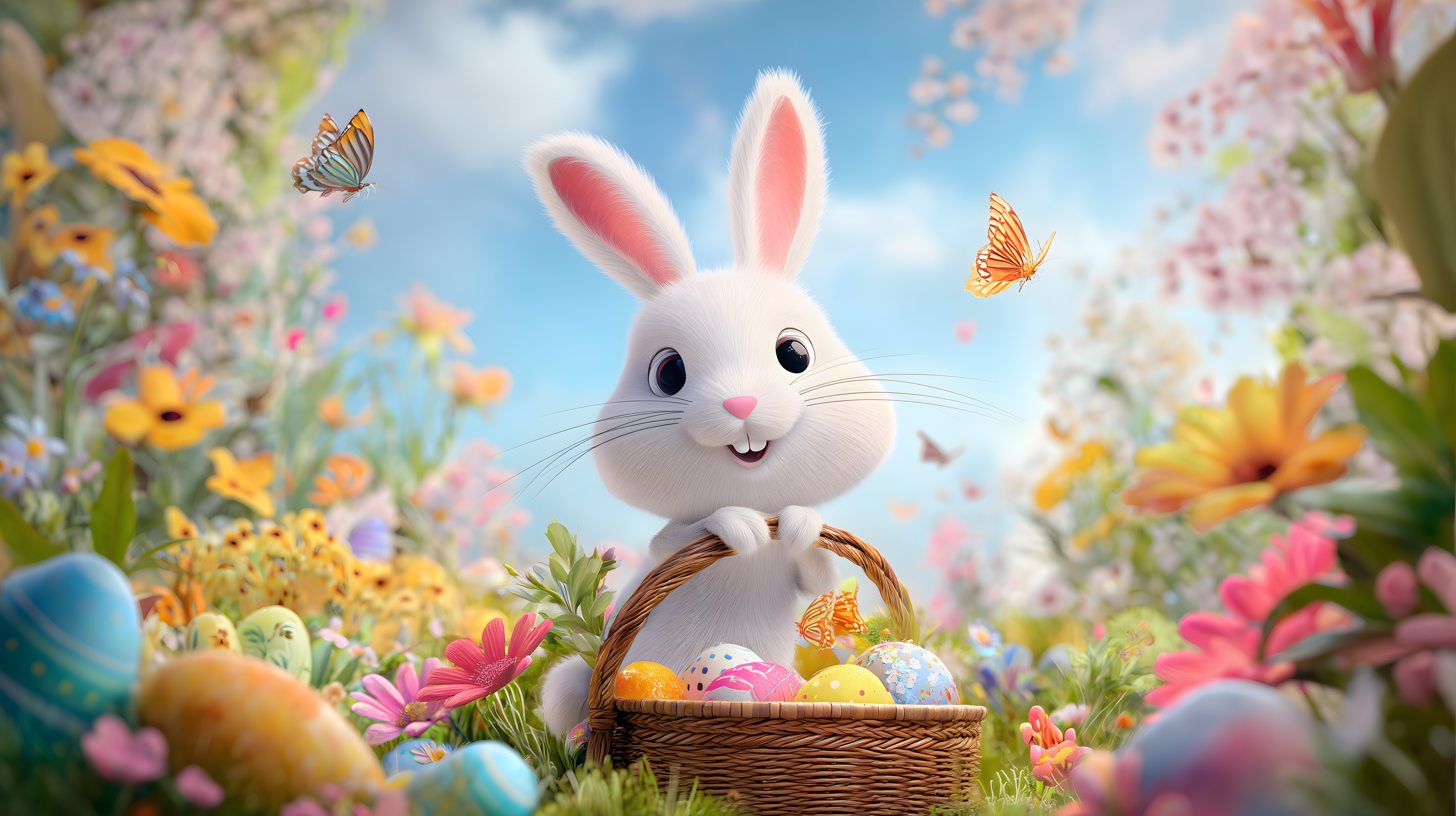 Dieses fröhliche Osterbild zeigt einen weißen Hasen, der einen Korb voller bunter Ostereier durch eine blühende Frühlingslandschaft trägt. Im Hintergrund sind Schmetterlinge zu sehen, die über einer Wiese voller farbenfroher Blumen flattern. Das Bild strahlt eine heitere, optimistische Stimmung aus und eignet sich hervorragend als kostenloses Stockfoto für Osterdekorationen, Werbematerial zu Ostern oder Illustrationen in Newslettern und Blogbeiträgen. Das hochaufgelöste Foto steht unter einer Creative Commons-Lizenz zur Verfügung.