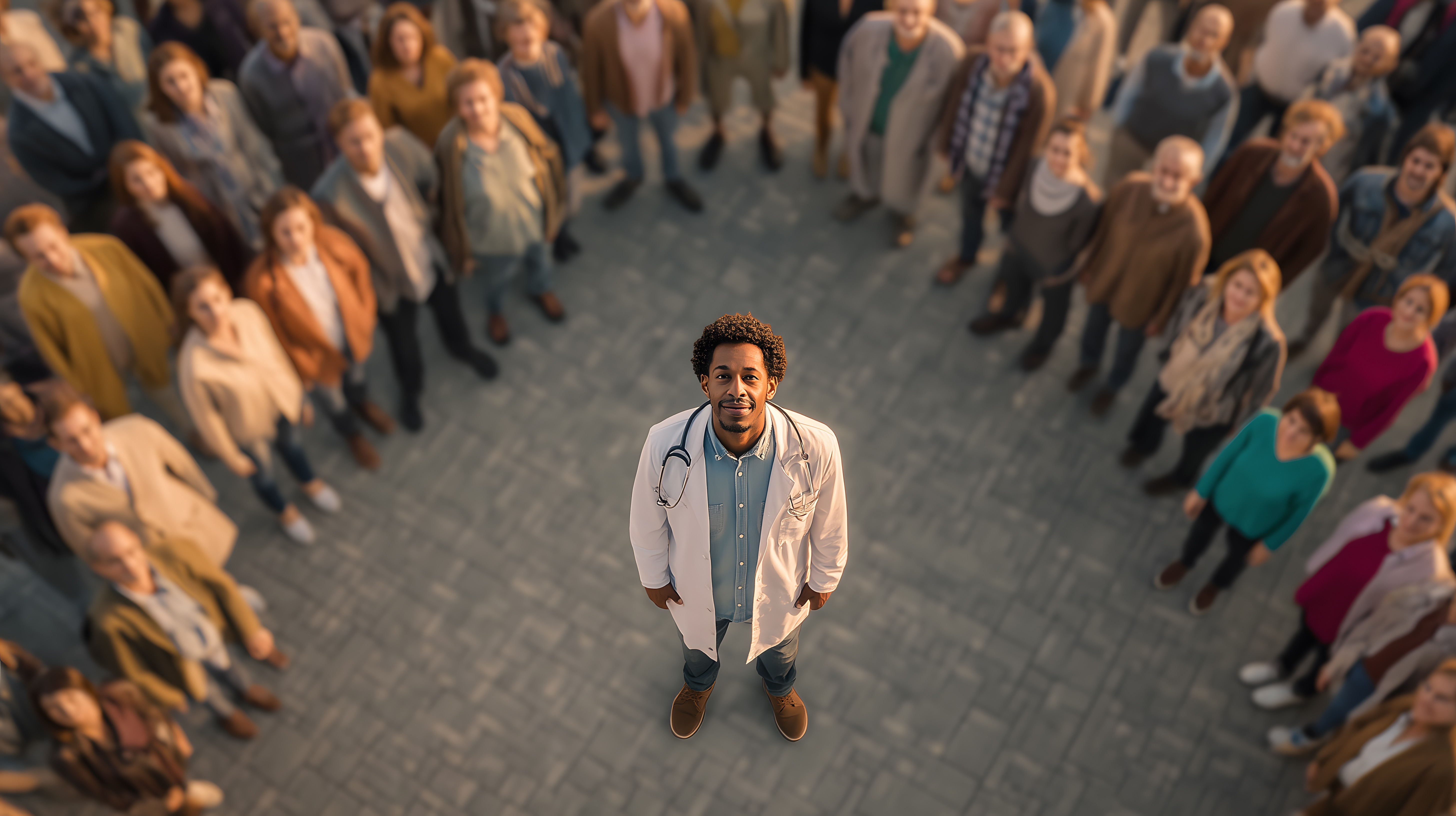 Das Foto zeigt eine Ärztin, die inmitten einer großen, vielfältigen Menschenmenge steht. Die Menschen um sie herum sind bunt gekleidet und vermitteln den Eindruck einer lebendigen, dynamischen Gemeinschaft. Die Ärztin nimmt eine zentrale Position ein und scheint eine vertrauensvolle Beziehung zu den Menschen um sich herum zu haben. Das Bild vermittelt Themen wie Führung, Zusammenhalt und Diversität im Gesundheitswesen.