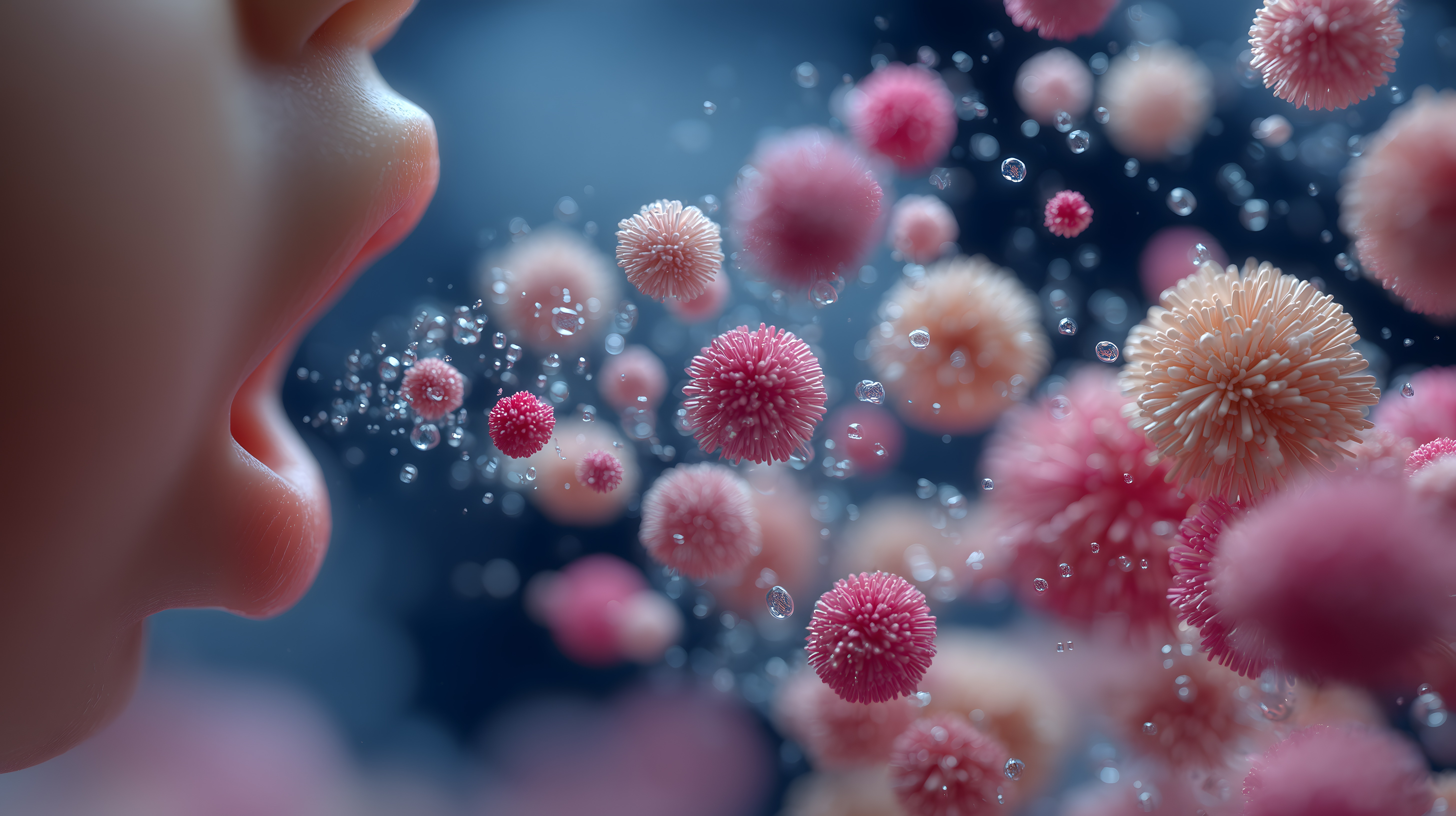 Das hochauflösende Stockfoto zeigt eine nahsichtige Aufnahme des menschlichen Gesichts mit Fokus auf dem Mund und den Atempartikeln in der Luft. Die zahlreichen, leuchtend roten, pilzartigen Strukturen symbolisieren die luftgetragenen Viren und Mikroben, die beim Atmen ausgestoßen werden. Das Bild vermittelt visuell die Übertragung von Krankheitserregern über die Atemluft und kann beispielsweise in Artikeln zur Medizin, Gesundheit oder Virologie eingesetzt werden. Dieses faszinierende, hochwertige Stockfoto in hoher Auflösung steht unter einer kostenlosen Creative-Commons-Lizenz zur Verfügung.