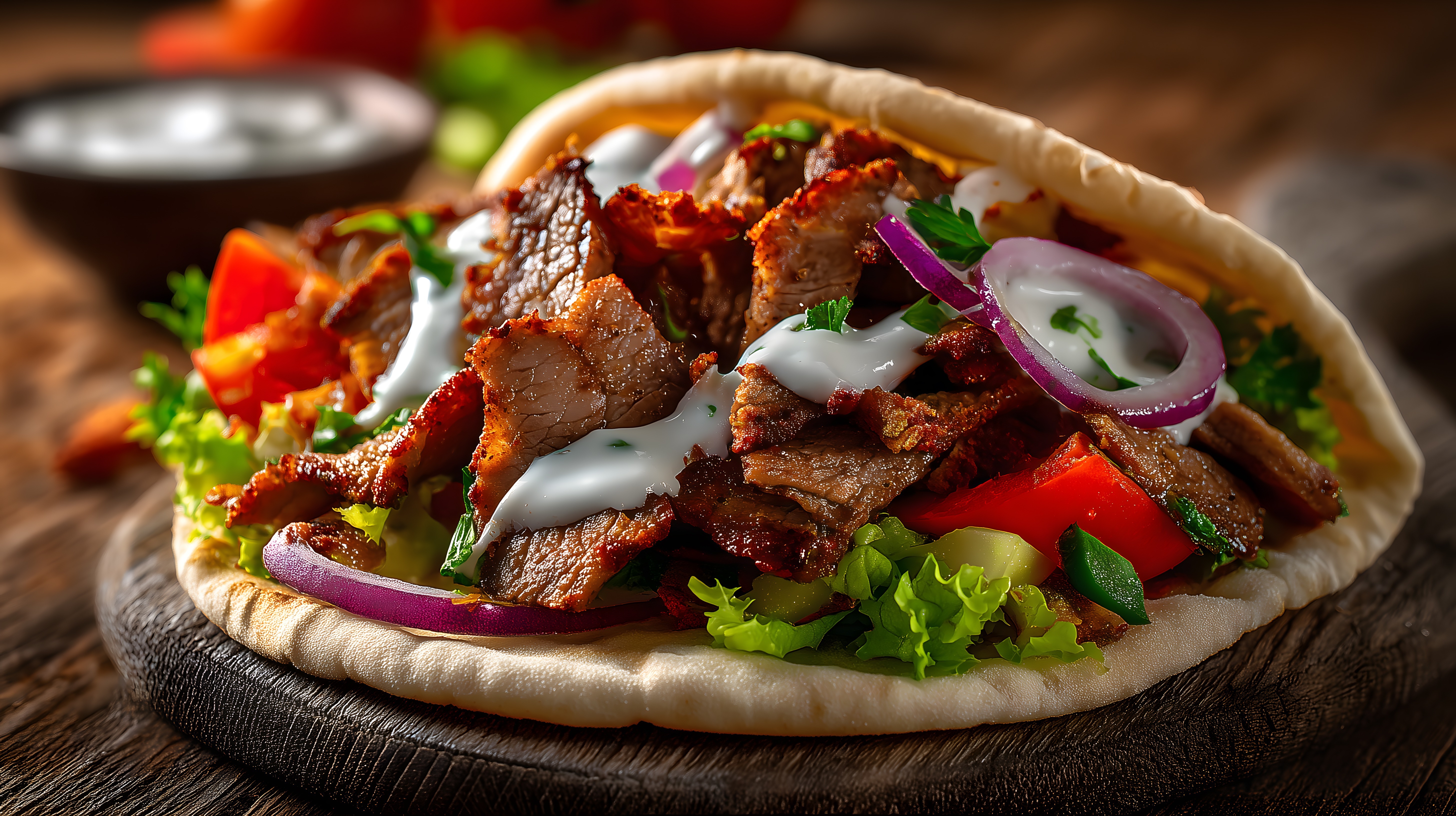 Das Bild zeigt einen leckeren Falafel-Salat, der in einer Pita-Tasche serviert wird. Die Tasche ist mit saftigen Stücken von mariniertem Fleisch, knackigem Gemüse wie Tomaten und Zwiebeln sowie einer cremigen Sauce gefüllt. Das Gericht wird auf einem rustikalen Holztisch präsentiert, was dem Bild eine gemütliche und appetitliche Atmosphäre verleiht. Dieses hochwertige Stockfoto in hoher Auflösung eignet sich ideal für die Verwendung in Blogs, Newslettern, Social-Media-Beiträgen oder Werbematerialien zum Thema leckere Imbissgerichte, Mittlerer Osten oder gesunde Ernährung. Es steht unter einer Creative-Commons-Lizenz zur kostenfreien Nutzung zur Verfügung.
