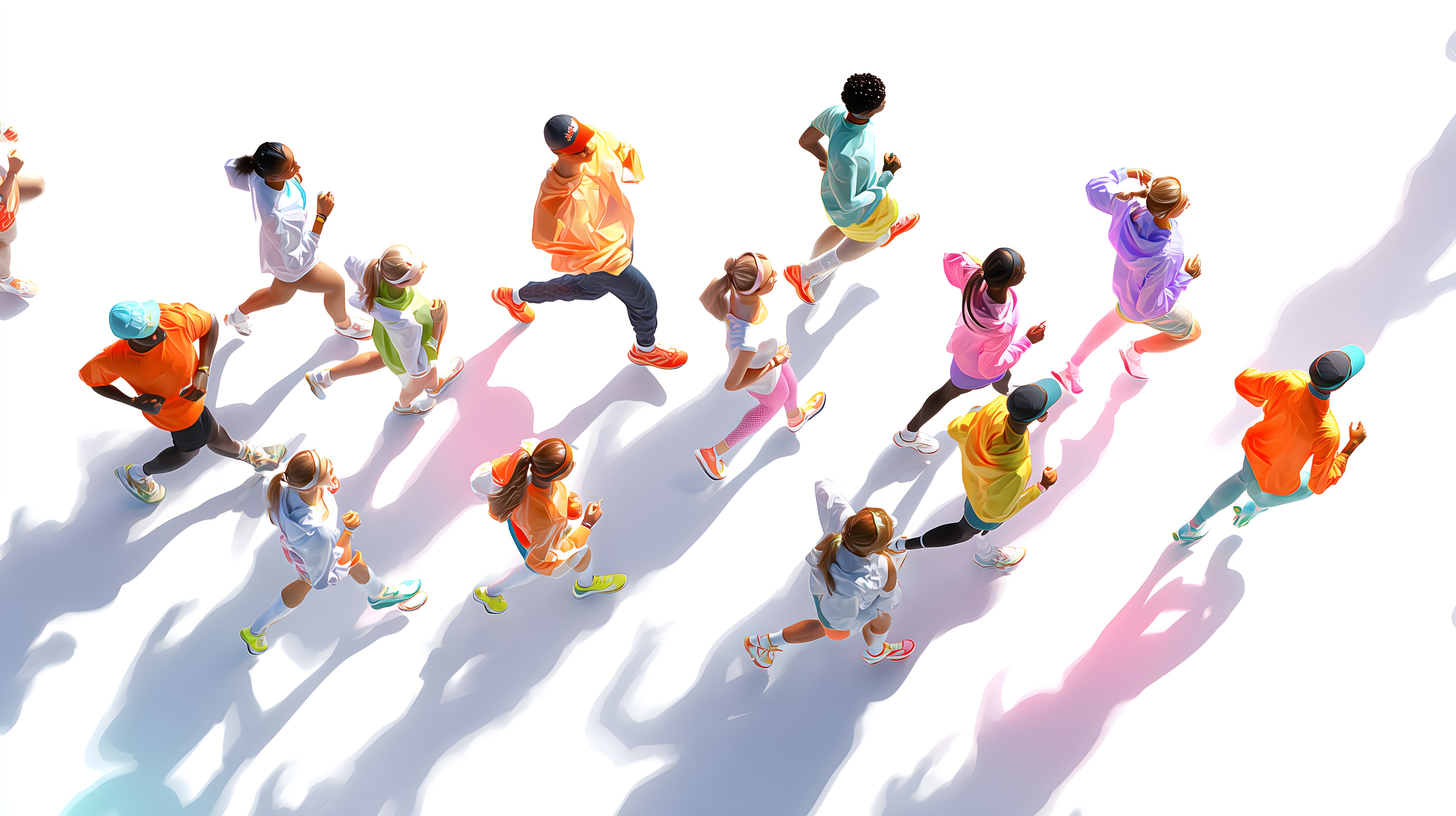Das Foto zeigt eine Gruppe von Läufern in bunter Sportbekleidung, die aus der Vogelperspektive aufgenommen wurde. Die Athleten rennen nebeneinander auf einer ebenen Fläche, ihre langen Schatten sind im Hintergrund zu sehen. Das Bild versprüht eine dynamische und energetische Stimmung durch die farbenfrohe Darstellung und die Bewegung der Läufer. Es eignet sich hervorragend als Motivationsbild für Sport- und Fitnesskampagnen sowie für Printmedien, Social-Media-Posts oder Werbematerialien rund um einen aktiven Lebensstil. Das hochauflösende Foto steht unter der Creative-Commons-Lizenz kostenlos zur Verfügung.