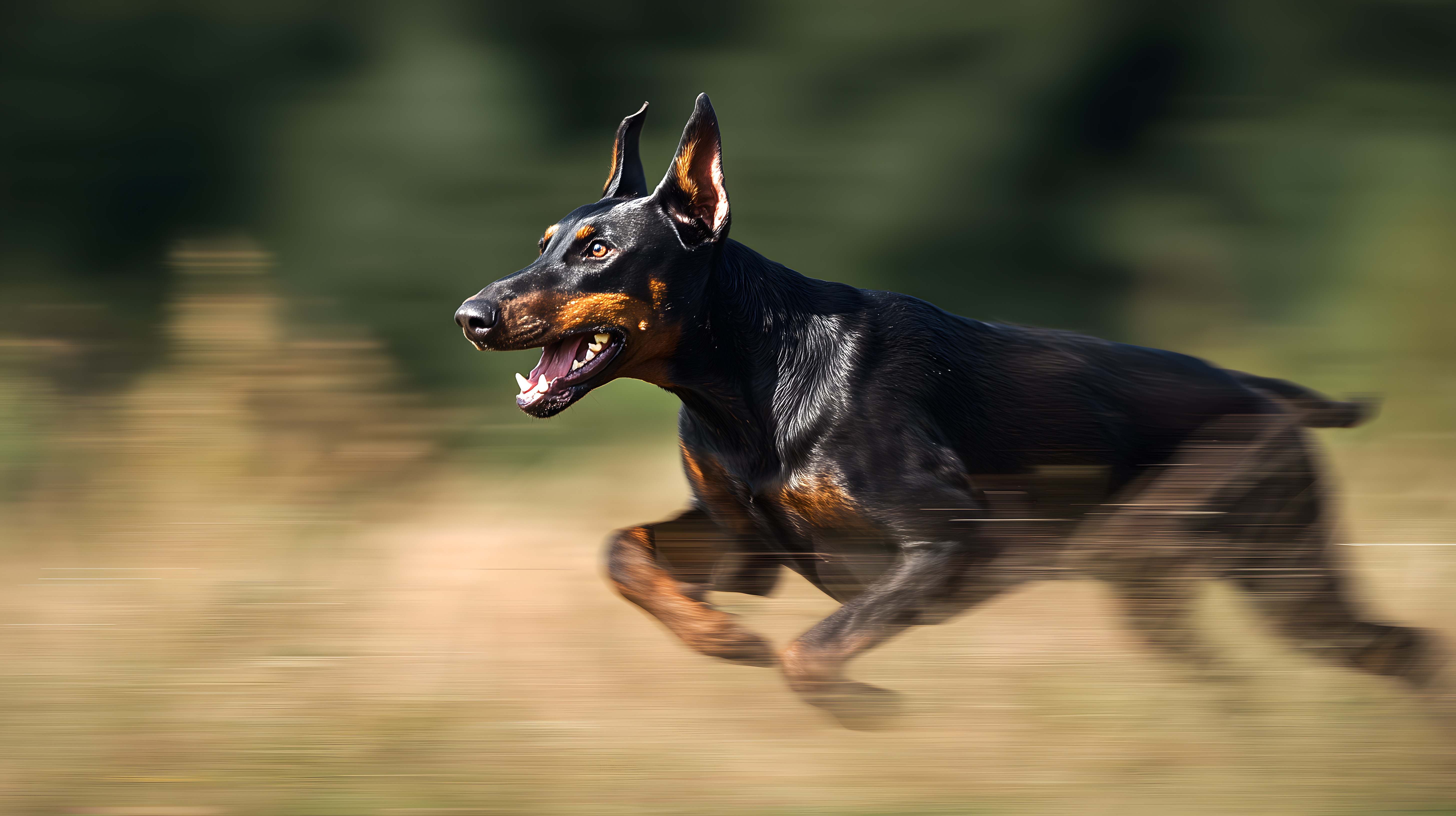 Das Foto zeigt einen rennenden, schwarzen Dobermann auf einer grünen Wiese. Der Hund läuft in voller Geschwindigkeit, die Beine sind verwischt und sein Körper ist angespannt. Der Dobermann hat den Kopf aufrecht und den Mund geöffnet, was einen entschlossenen und dynamischen Eindruck vermittelt. Die Umgebung ist unscharf, wodurch der Fokus ganz auf den Hund gelenkt wird. Dieses Bild eignet sich hervorragend für Blog-Beiträge, Social-Media-Posts oder Werbematerialien, die Energie, Kraft und Bewegung transportieren wollen. Es ist ein kostenloses Stockfoto in hoher Auflösung und unter einer Creative-Commons-Lizenz verfügbar.