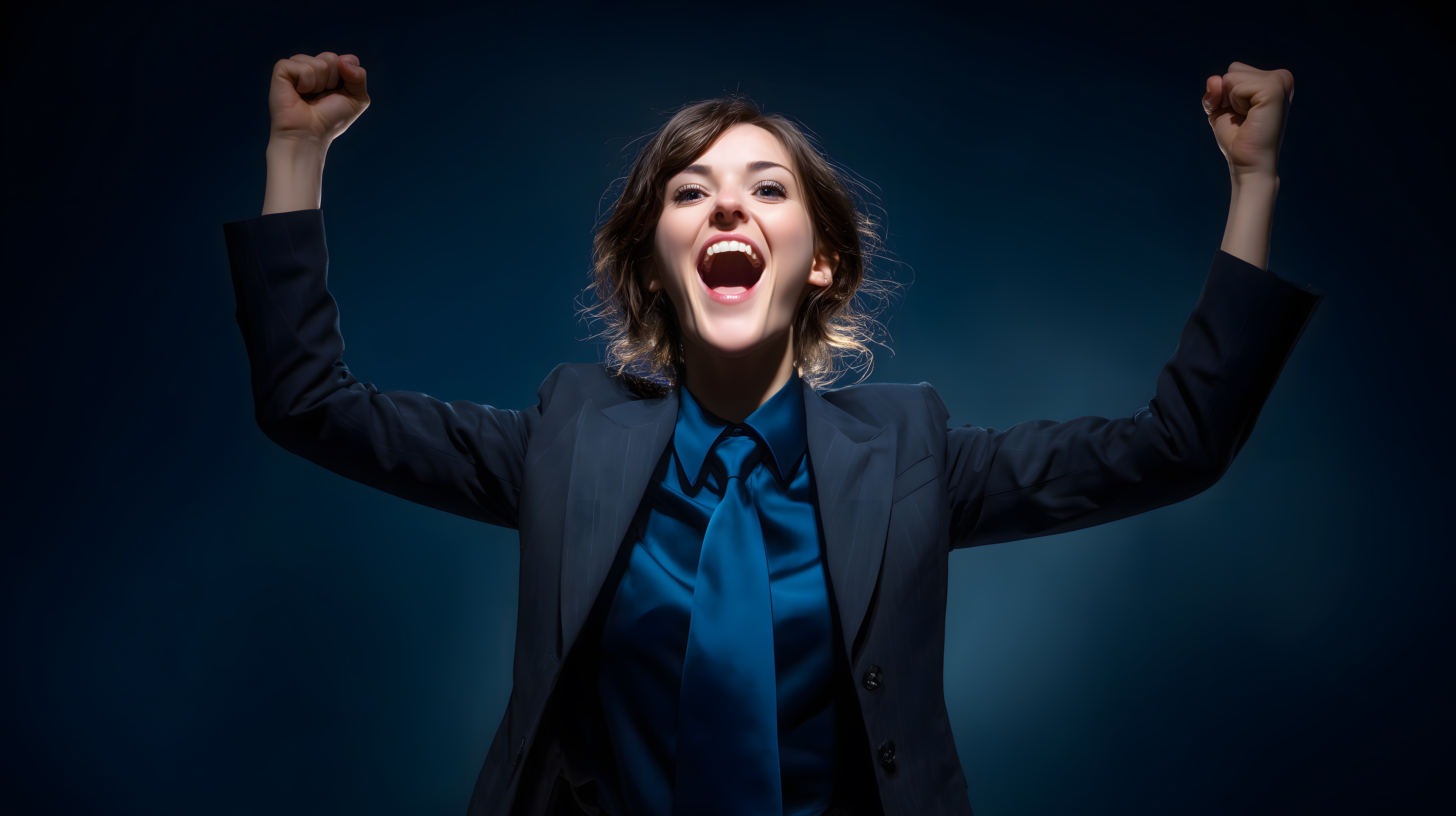 Das Bild zeigt eine selbstbewusste Geschäftsfrau, die ihre Arme triumphierend in die Luft wirft und dabei einen lauten Jubelschrei ausstößt. Sie trägt einen dunklen Anzug und einen blauen Schlips, ihre Haare sind wild zerzaust. Der Hintergrund ist dunkel gehalten, wodurch die Frau im Mittelpunkt steht und ihre Freude und Zufriedenheit deutlich zum Ausdruck kommt.