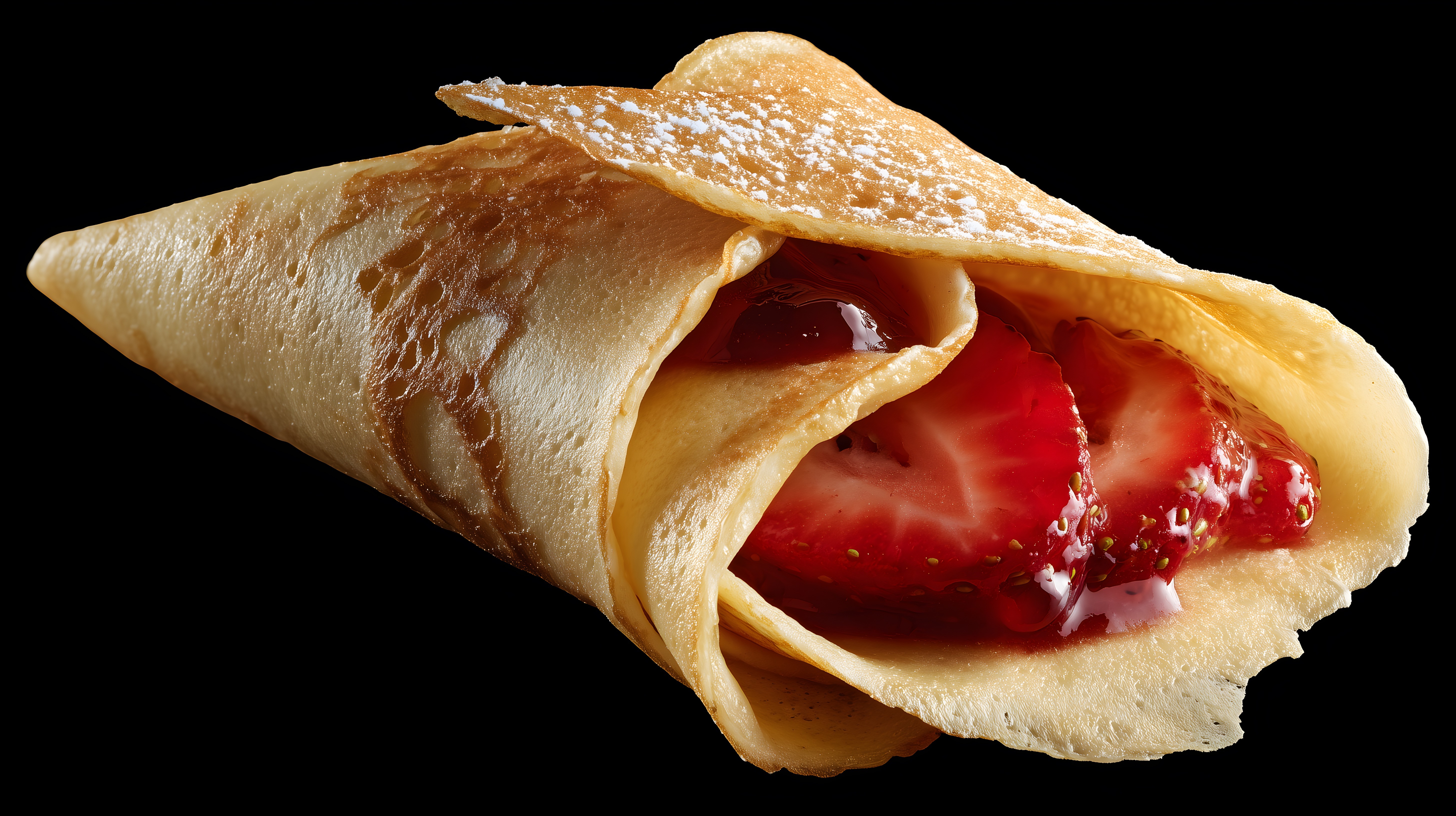 Das Bild zeigt einen appetitlichen Erdbeercrepe, der auf einem schwarzen Hintergrund angeordnet ist. Der Crepe ist goldbraun gebacken und hat eine leichte, knusprige Struktur. Die Füllung besteht aus frischen, roten Erdbeeren, die saftig und verlockend aussehen. Über den Crepe ist etwas heller Sirup oder Honig gegossen, was dem Gericht einen zusätzlichen Geschmackskontrast und eine glänzende Optik verleiht. Die Perspektive ist nah und fokussiert, sodass die Textur und Zusammensetzung des Crepes deutlich erkennbar sind. Dieses Stockfoto eignet sich hervorragend für Foodblogs, Rezeptsammlungen, Menügestaltung oder Werbung für Cafés und Konditoreien. Es ist in hoher Auflösung und unter einer Creative-Commons-Lizenz frei nutzbar.