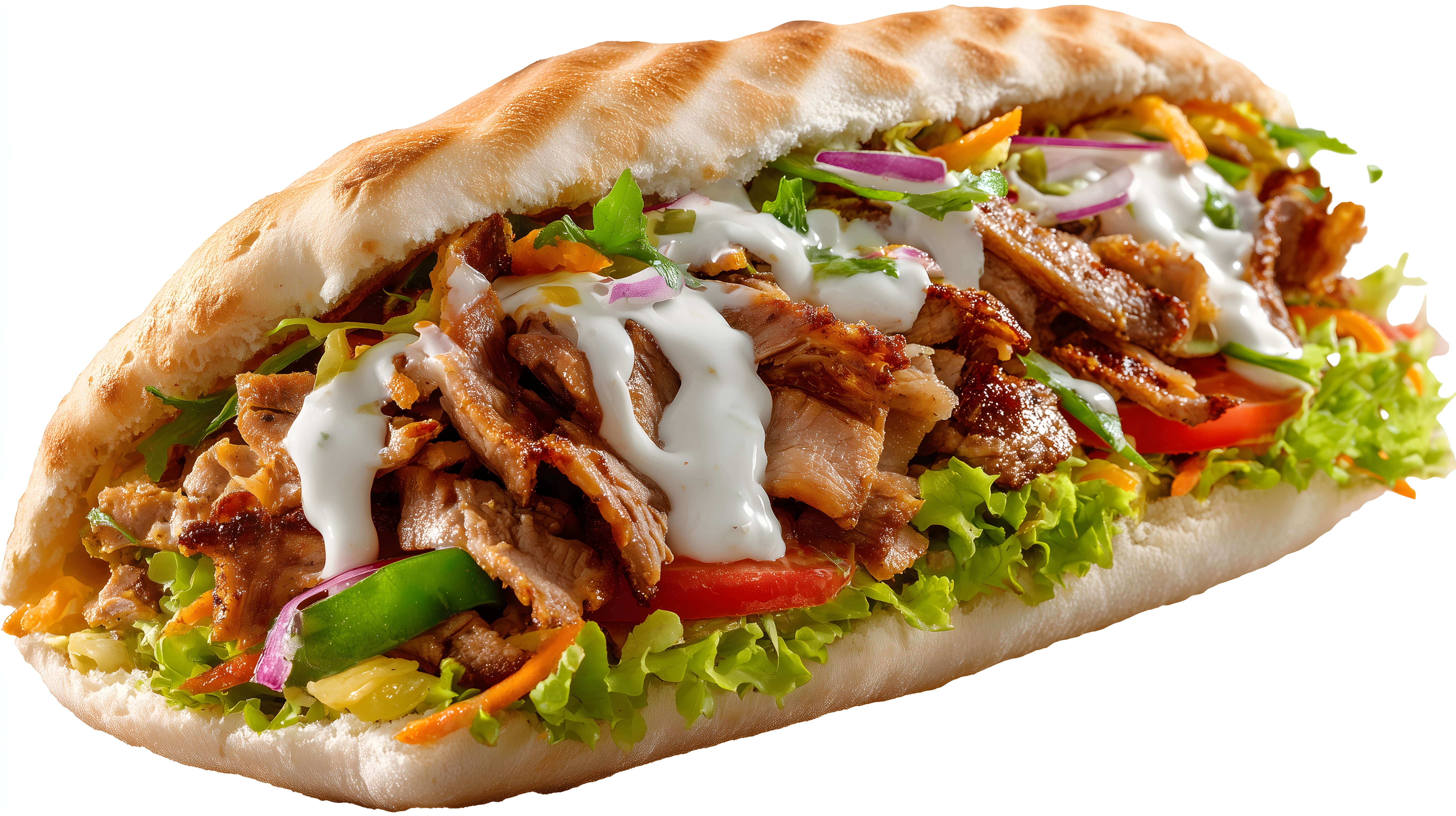 Dieses Foto zeigt eine verlockende Dönertasche, die mit knusprig gebratenem Fleisch, frischen Salatzutaten wie Tomaten, Gurken und Rot-Zwiebeln sowie einer cremigen Sauce gefüllt ist. Das Fladenbrot ist leicht gebräunt und verleiht dem Gericht eine authentische Optik. Das Bild eignet sich hervorragend als Titelbild für Rezepte, Restaurantportfolios oder Foodblogs. Als hochwertiges, kostenloses Stockfoto unter Creative-Commons-Lizenz kann es auch in Werbe- und Marketingmaterialien verwendet werden.