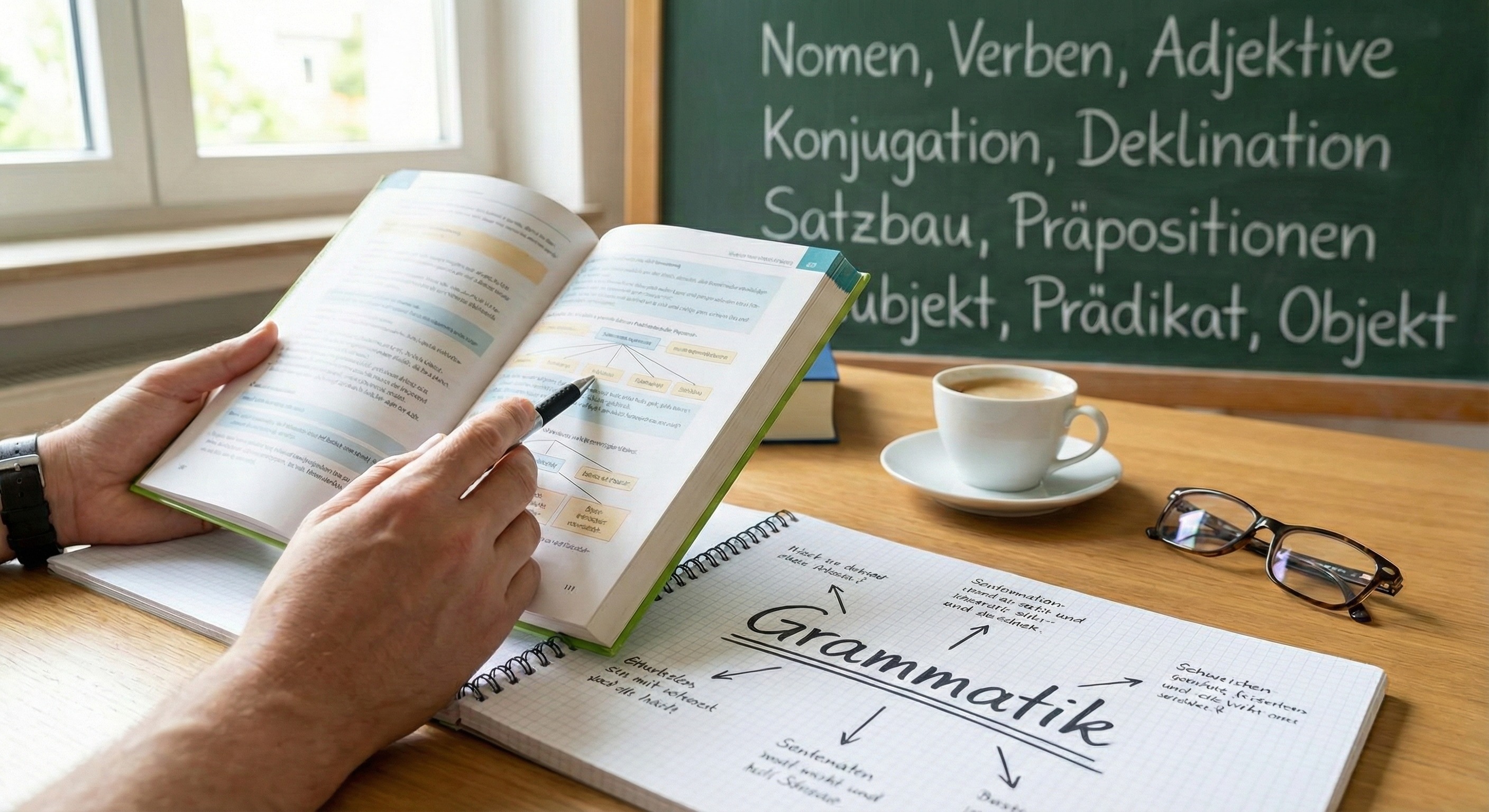 Dieses Stockfoto zeigt einen Arbeitsplatz für das Lernen der deutschen Grammatik. Im Vordergrund sieht man ein Notizbuch, Bücher und einen Stift, die darauf hinweisen, dass intensiv gelernt wird. Im Hintergrund ist eine Tafel mit einer Auflistung grammatikalischer Themen wie Nomen, Verben, Adjektive, Konjugation und Deklination zu sehen. Ein Kaffeebecher und eine Brille vervollständigen die Szene, die ein gemütliches Lernumfeld vermittelt.