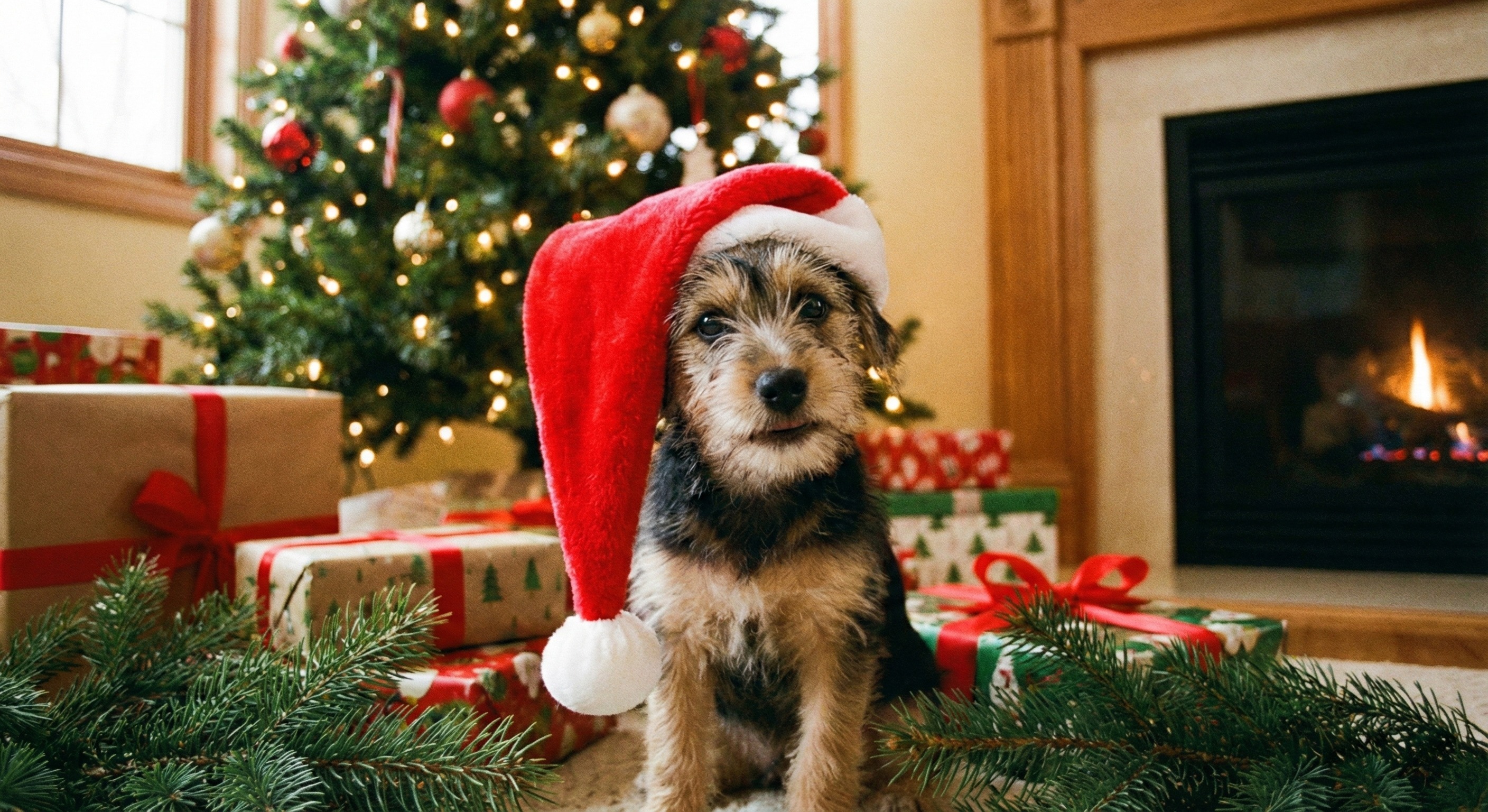 Das Bild zeigt einen süßen Hund, der eine rote Weihnachtsmütze trägt und vor einem geschmückten Weihnachtsbaum sitzt. Im Hintergrund sind Geschenke und eine Kaminfeuerung zu sehen, was eine gemütliche, weihnachtliche Stimmung vermittelt. Dieses hochauflösende Stockfoto eignet sich hervorragend für Weihnachtsgrüße, Blogbeiträge, Newsletter oder Werbung in der Weihnachtszeit. Es ist unter der Creative-Commons-Lizenz frei verwendbar.