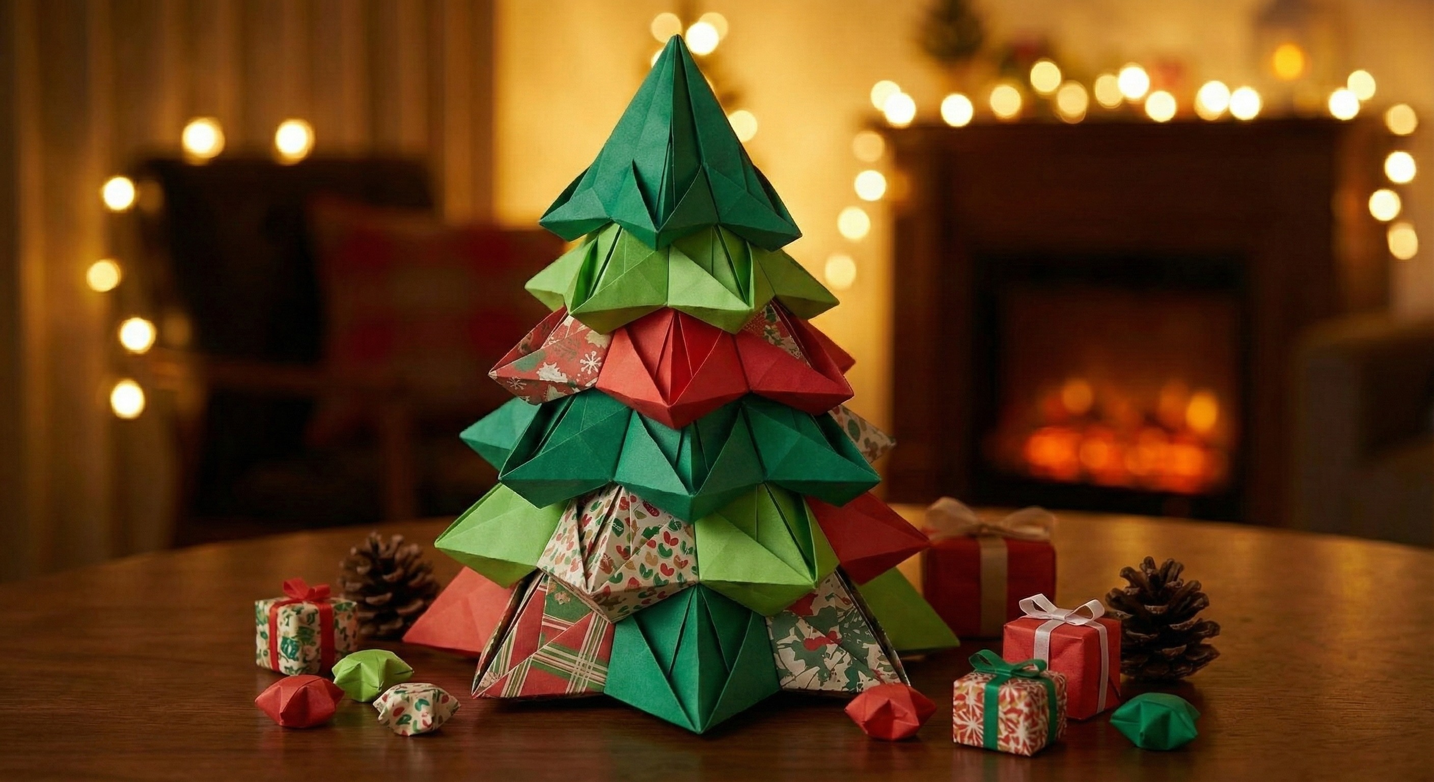 Das Bild zeigt einen detaillierten Origami-Weihnachtsbaum, der auf einem Holztisch steht. Der Baum ist aus grünem und rotem Papier gefaltet und mit kleinen Geschenkboxen und Tannenzapfen dekoriert. Im Hintergrund ist ein knisternder Kamin zu sehen, der eine gemütliche, weihnachtliche Atmosphäre schafft. Die Szene ist mit warmen Lichterketten beleuchtet, die dem Ganzen einen stimmungsvollen Charakter verleihen. Dieses hochauflösende Foto eignet sich hervorragend als kostenloses Stockfoto für Weihnachtsgrüße, Blogbeiträge oder Werbematerialien unter der Creative Commons-Lizenz.