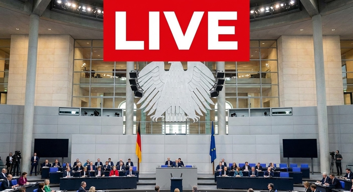 Das Foto zeigt den Plenarsaal des Deutschen Bundestags in Berlin, in dem eine Live-Sitzung stattfindet. Der große, moderne Raum ist mit hohen Glasfronten, Lichtinstallationen und dem Staatswappen der Bundesrepublik Deutschland gestaltet. Die Abgeordneten sitzen an langen Tischreihen und nehmen an den parlamentarischen Debatten teil.