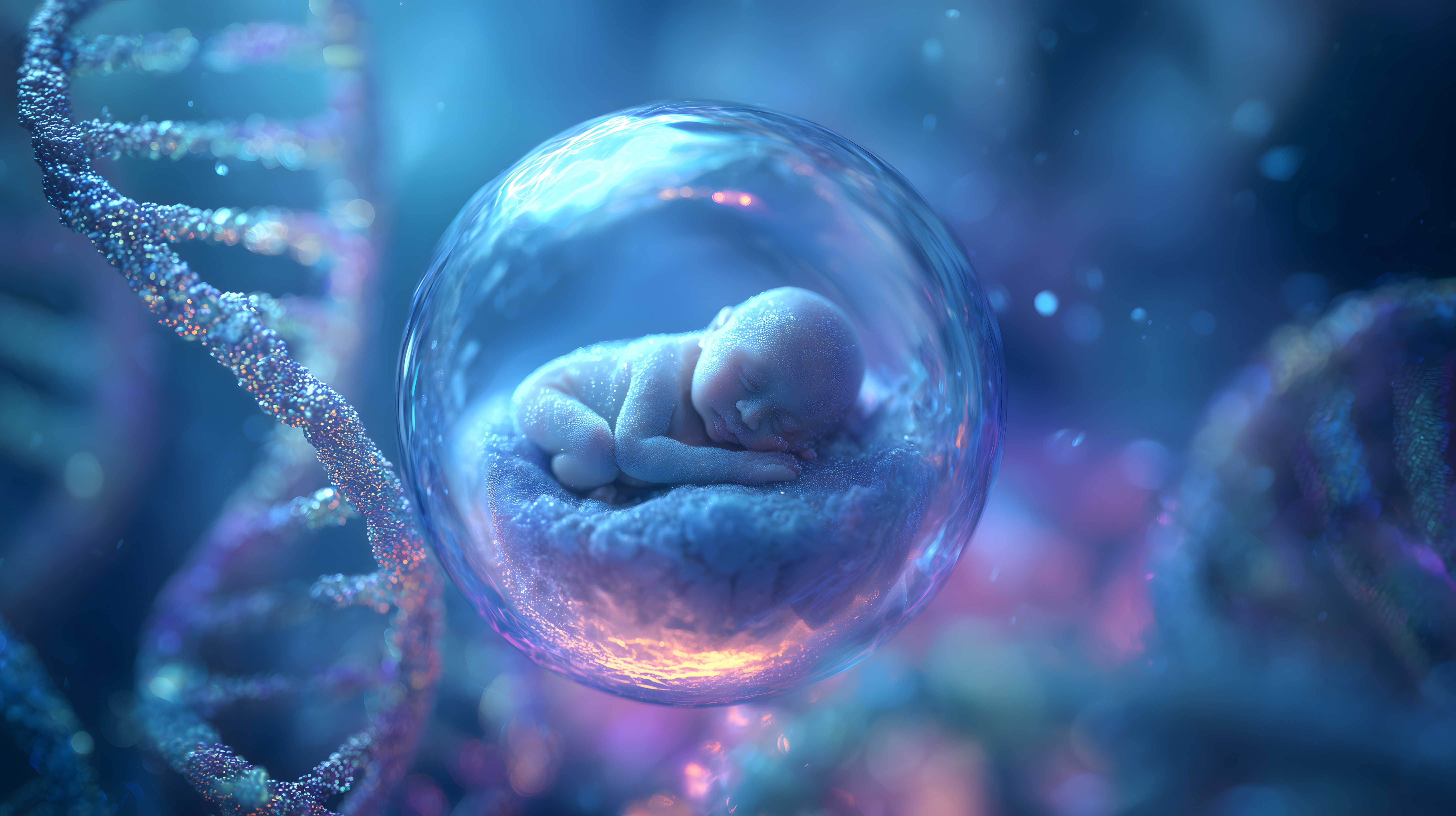 Dieses faszinierende Bild zeigt einen Embryo, der in einer schwebenden Blase geschützt und umhüllt von DNA-Strängen zu sehen ist. Die Szenerie ist in ein wunderschönes, fantasievolles Licht gehüllt, das von intensiven Blau-, Lila- und Rosatönen dominiert wird. Dieses außergewöhnliche Stockfoto eignet sich hervorragend für Beiträge zu Themen wie Fortpflanzung, Wissenschaft, Medizin oder auch für kreative Projekte in den Bereichen Grafik, Design oder Illustration. Das hochauflösende Bild steht unter einer Creative-Commons-Lizenz zur kostenlosen Nutzung zur Verfügung.