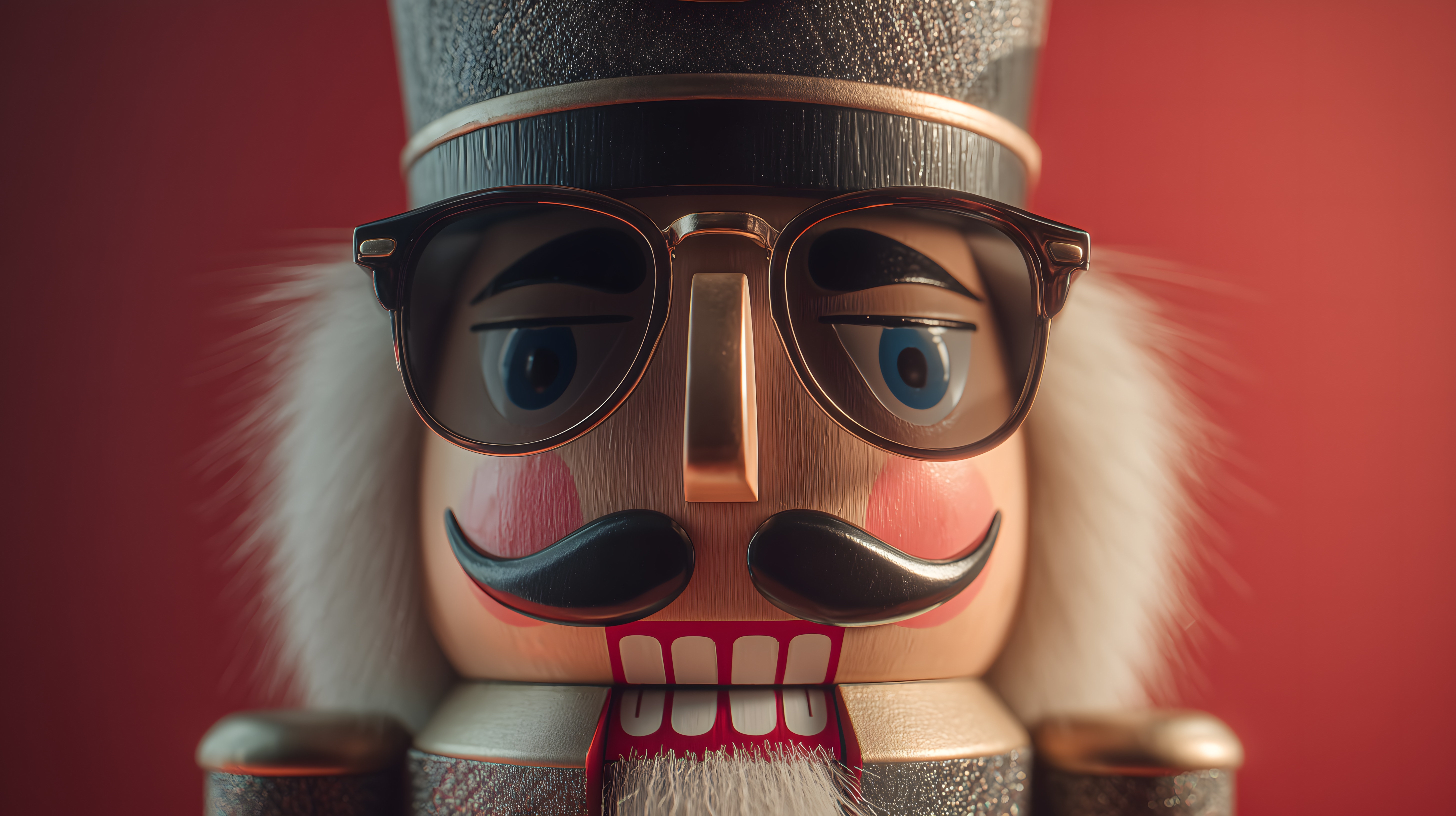 Dieses Foto zeigt eine typische Nussknacker-Figur, wie man sie oft zu Weihnachten findet. Die Figur ist aus Holz gefertigt und in Rot und Braun gehalten. Sie trägt eine Brille und einen markanten Schnurrbart, was ihr ein eher ernsthaftes, aber auch charmantes Aussehen verleiht. Der Nussknacker steht vor einem roten Hintergrund, der den Fokus ganz auf die detailreiche Gestaltung der Figur lenkt. Dieses Stockfoto eignet sich hervorragend für Weihnachts- und Winterdekorationen, aber auch für Blogbeiträge, Newsletterdesigns oder Werbeanzeigen mit einem nostalgischen, traditionellen Flair.