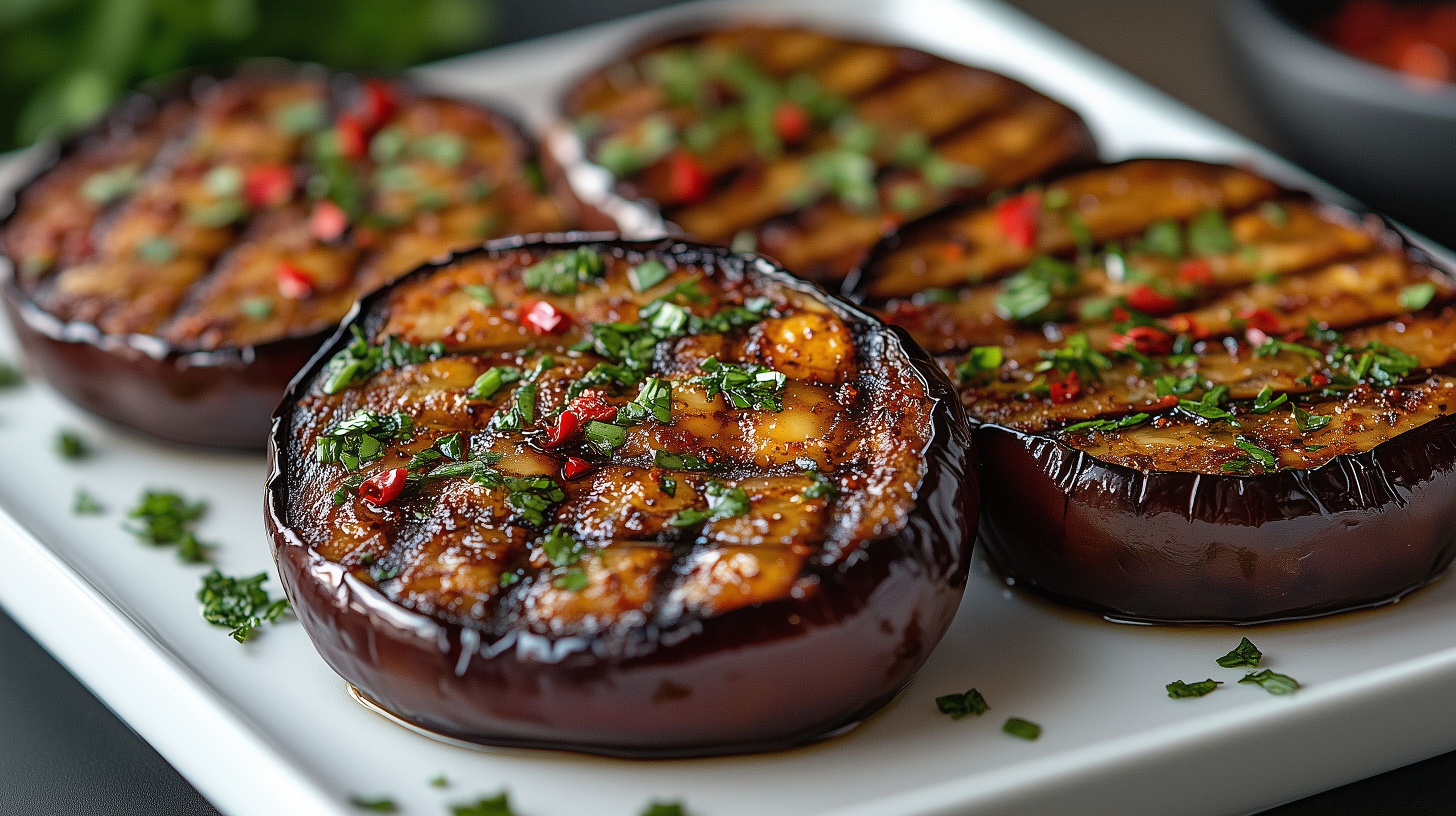 Das Bild zeigt frisch gegrillte Auberginenscheiben auf einem hellen Teller. Die Scheiben sind gleichmäßig angeordnet und mit einer würzigen Marinade aus Kräutern und Chili bedeckt, die einen appetitlichen, glänzenden Belag bildet. Die intensiven Farben und die rustikale Anmutung des Gerichts machen das Foto zu einem stimmungsvollen Motiv für den Einsatz in Blogs, Newslettern, Social-Media-Beiträgen oder Werbematerialien zum Thema gesunde, mediterrane Küche. Als hochwertiges Stockfoto in hoher Auflösung und unter einer Creative-Commons-Lizenz nutzbar, eignet es sich perfekt für kreative Projekte rund um Kochen, Ernährung und Kulinarik.