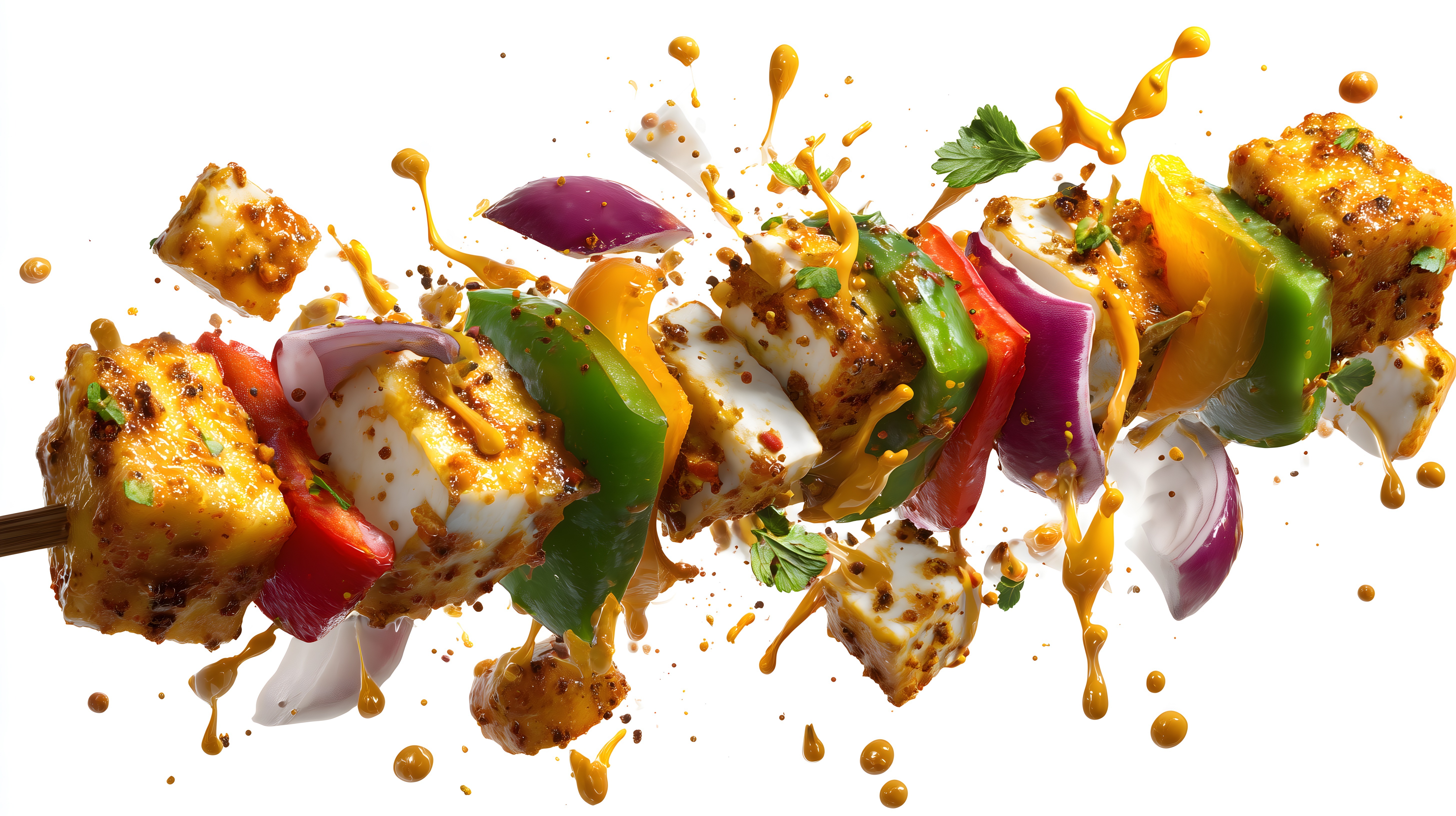 Dieses Foto zeigt eine Nahaufnahme von bunten, gegrillten Gemüsespießen. Die Spieße sind mit einer goldbraunen, würzigen Marinade überzogen und präsentieren eine bunte Farbpalette an verschiedenen Gemüsesorten wie Paprika, Zwiebel und Zucchini. Die Szene ist frisch und lebendig inszeniert, mit einzelnen Tropfen und Spritzern der Marinade, die die Spieße umgeben. Dieses Stockfoto eignet sich hervorragend für die Verwendung in Rezeptbüchern, Foodblogs, Restaurantportalen oder Werbekampagnen für gesunde, vegetarische Ernährung. Die hochauflösende Qualität und Creative-Commons-Lizenz machen es zu einem kostenlosen, vielseitig einsetzbaren Bild.