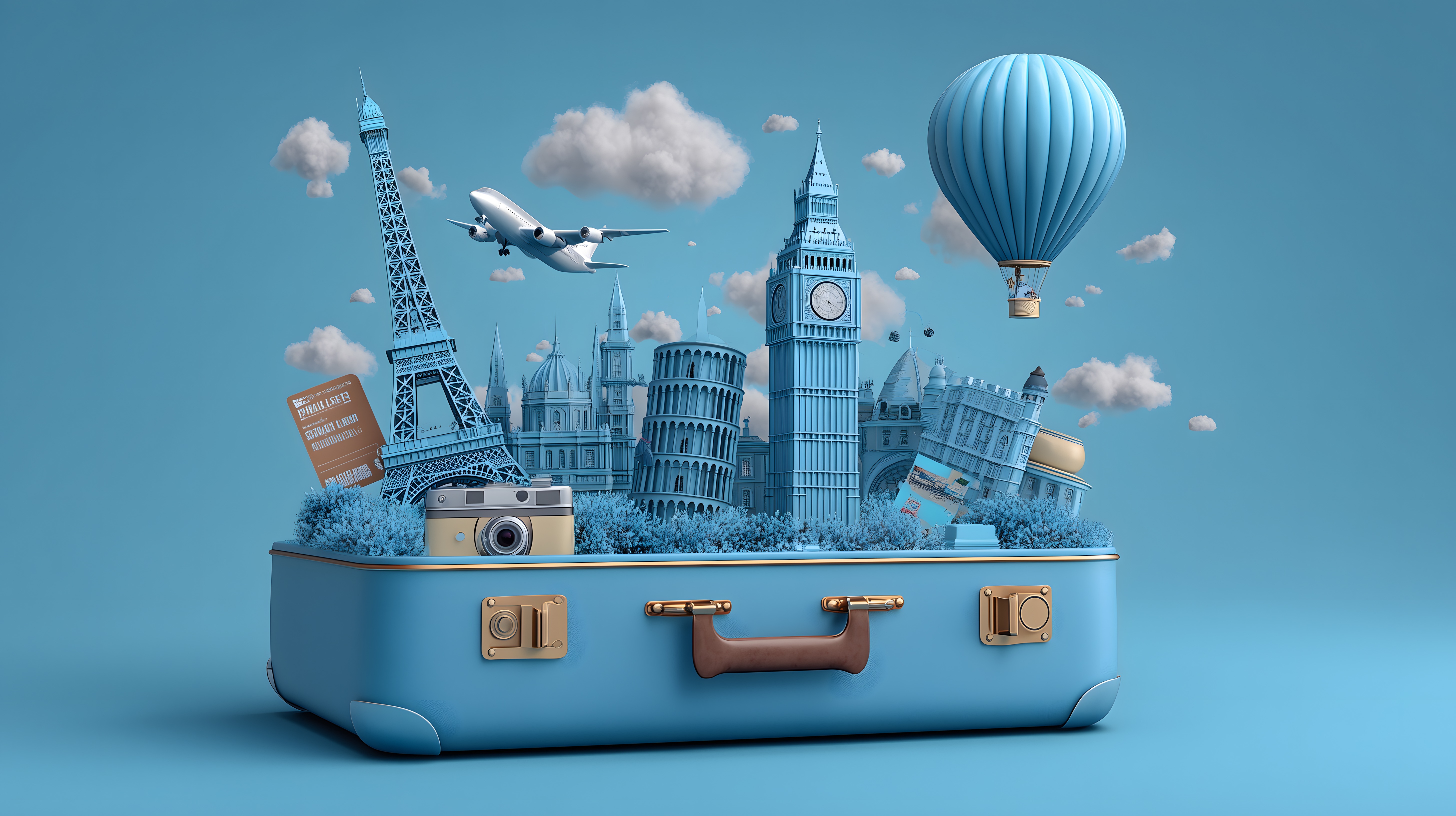 Dieses Bild zeigt eine kreative Darstellung einer Weltreise in einem Koffer. Der Koffer enthält verschiedene Sehenswürdigkeiten aus beliebten Reisezielen wie dem Eiffelturm, dem Big Ben und dem Schiefen Turm von Pisa. Darüber schweben ein Flugzeug und ein Heißluftballon, um den Reisecharakter zu unterstreichen. Dekorative Elemente wie eine Vintage-Kamera und eine Landkarte runden das Motiv ab.