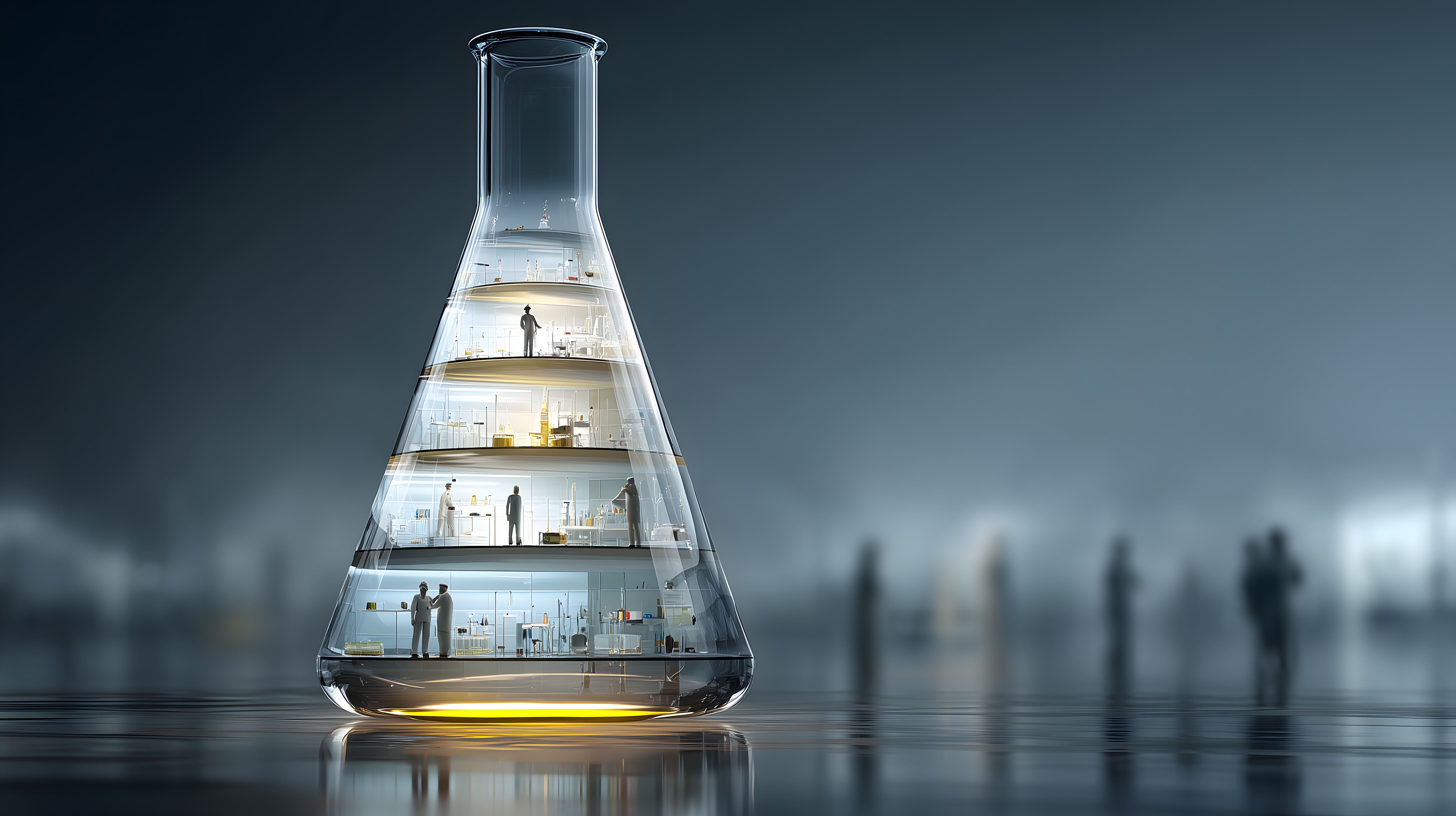 Dieses Stockfoto zeigt eine faszinierende Miniaturwelt in einem Erlenmeyerkolben. Der Glasbehälter ist durchsichtig und lässt einen Blick in ein futuristisches Labor-Ambiente erkennen. Verschiedene Ebenen und Stockwerke sind im Kolben zu sehen, mit Menschen, Labor-Ausrüstung und technischen Details. Die Beleuchtung verleiht dem Bild einen besonderen Effekt, sodass die Szene wie aus einem Wissenschafts-Thriller erscheinen mag. Dieses hochauflösende, kostenlose Stockfoto eignet sich ideal für Blogs, Newsletter, Social-Media-Beiträge oder Werbematerialien zum Thema Forschung, Technologie und Innovation.